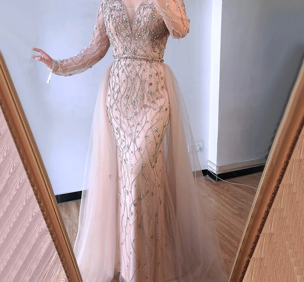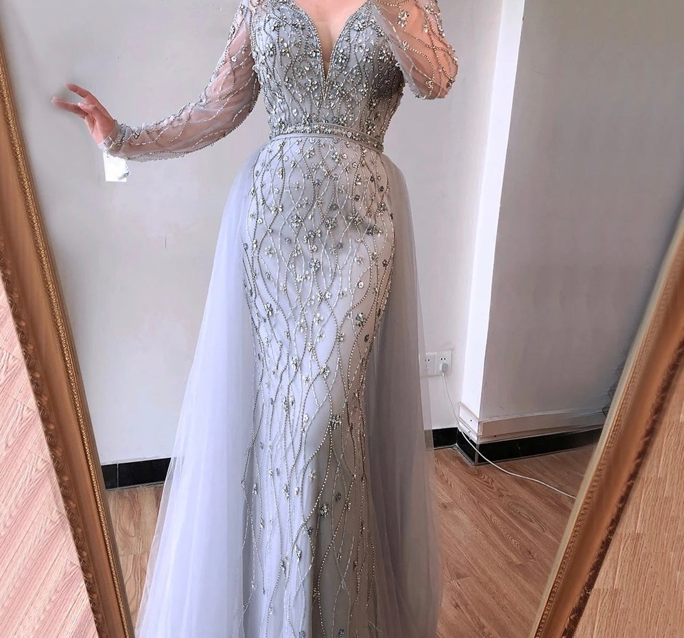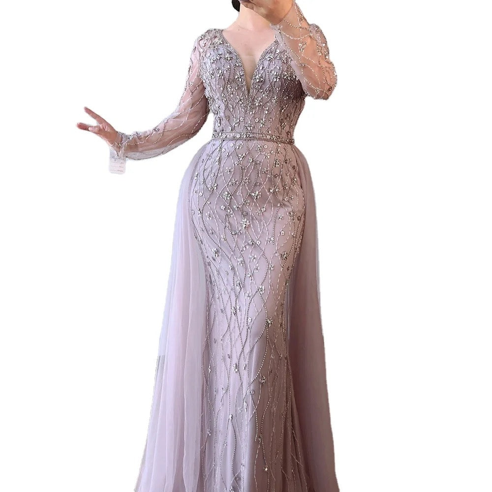This Alice gown exudes sophistication with its delicate lavender hue and intricate beaded detailing. The plunging neckline and sheer long sleeves add a touch of romance, while the fitted silhouette beautifully accentuates your curves. Perfect for making an elegant statement at any formal event.
