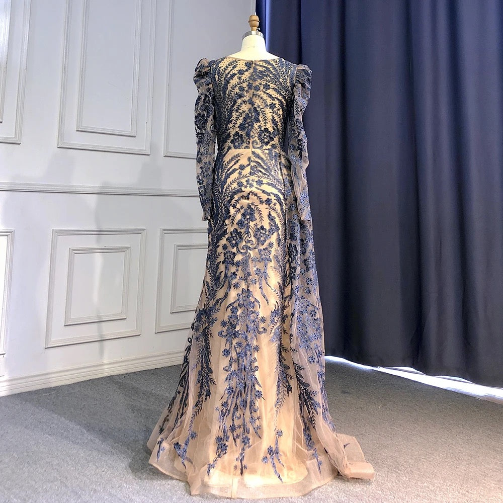 This stunning Amari gown features intricate lace detailing that contrasts beautifully with the nude underlay, creating an elegant and dramatic effect. The long sleeves and high neckline add a touch of sophistication, while the flowing skirt ensures you make a graceful entrance at any event. Perfect for those who want to make a bold yet classic statement