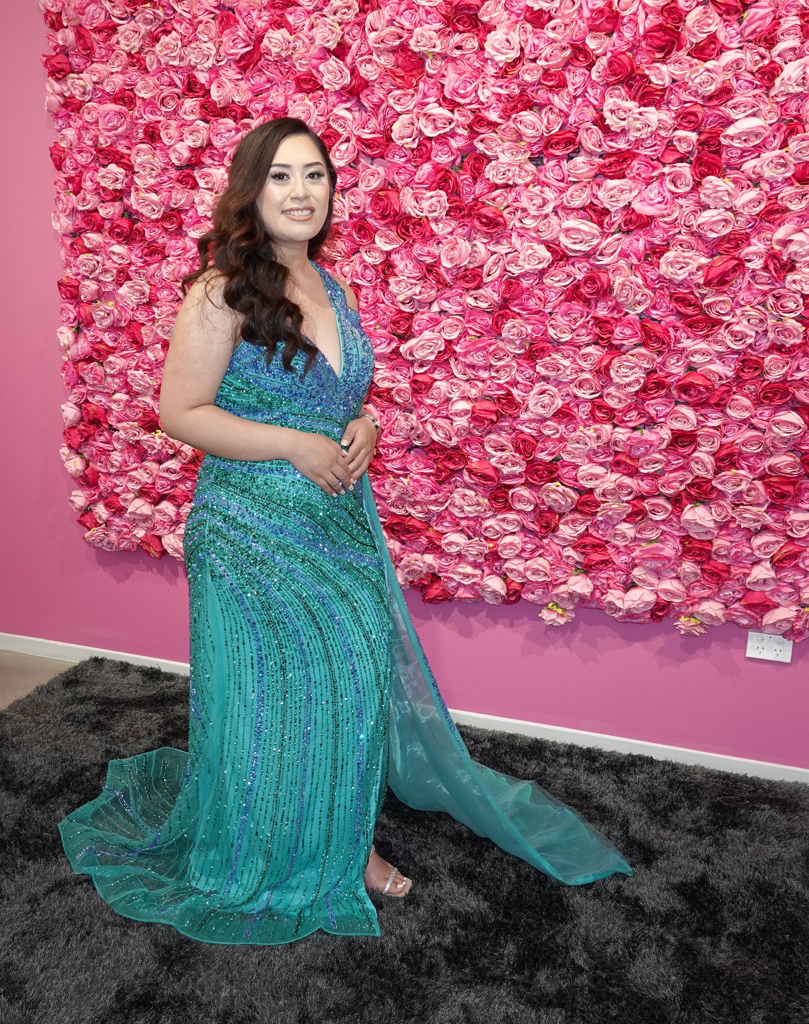 This Arista dress is a vibrant, mermaid-inspired gown featuring a deep V-neckline and a form-fitting silhouette that flares out into a dramatic train. The gown is adorned with shimmering blue and green sequins, creating an ombre effect that mimics the colors of the ocean. A thigh-high slit adds a touch of allure, while the sheer, flowing train adds a whimsical and elegant finish. This dress is perfect for standing out at a formal event or special occasion, exuding both boldness and grace.