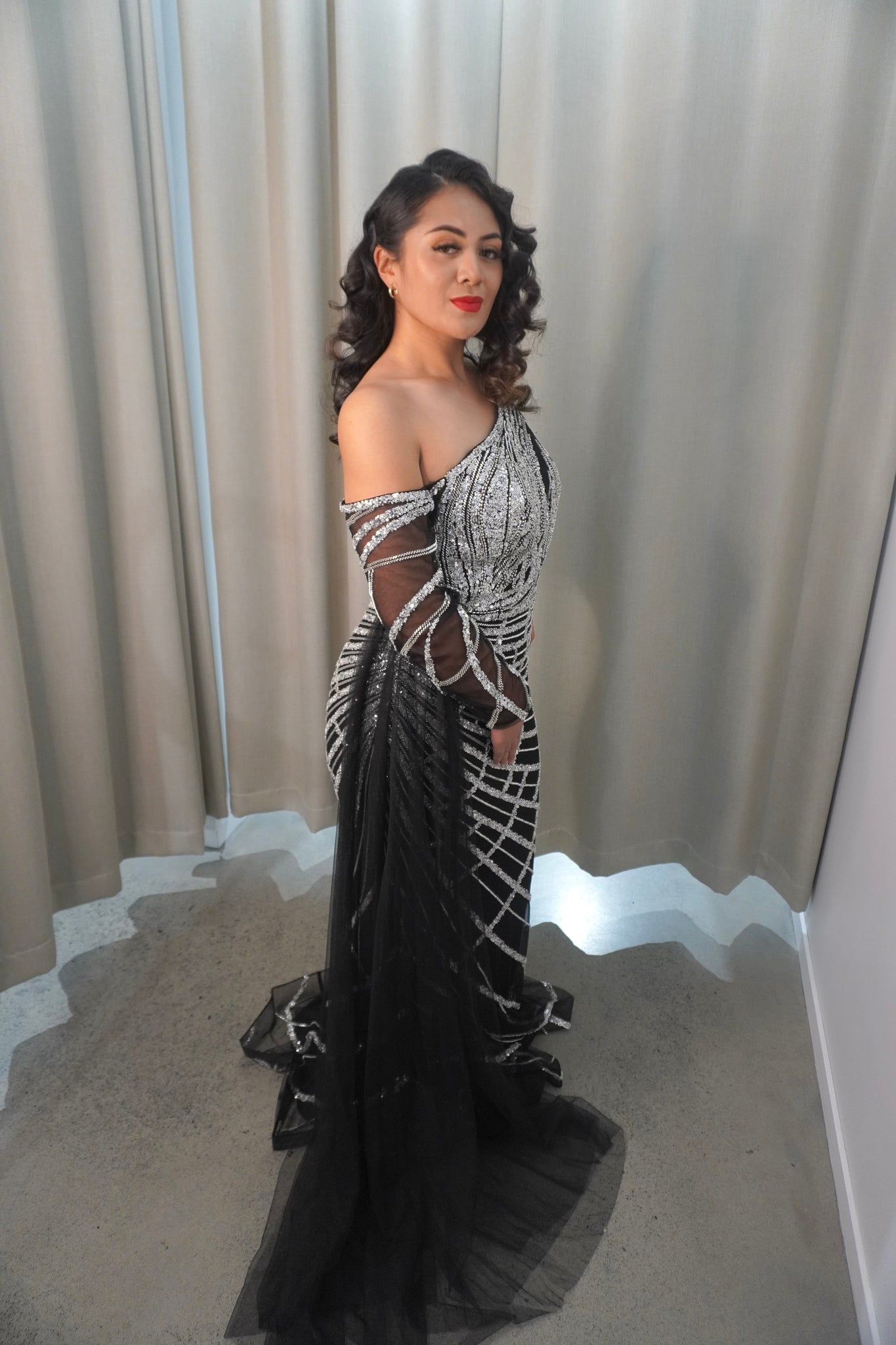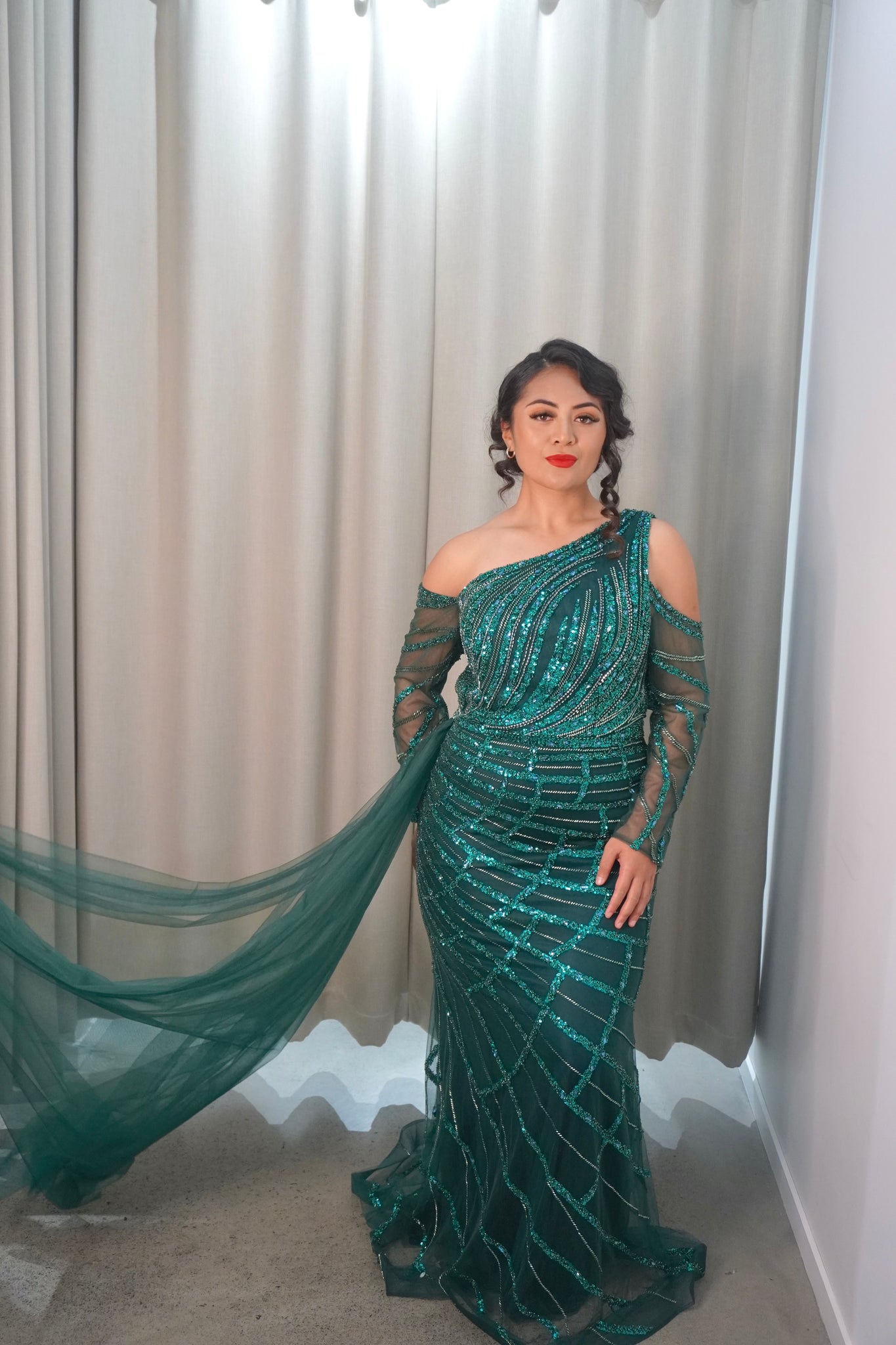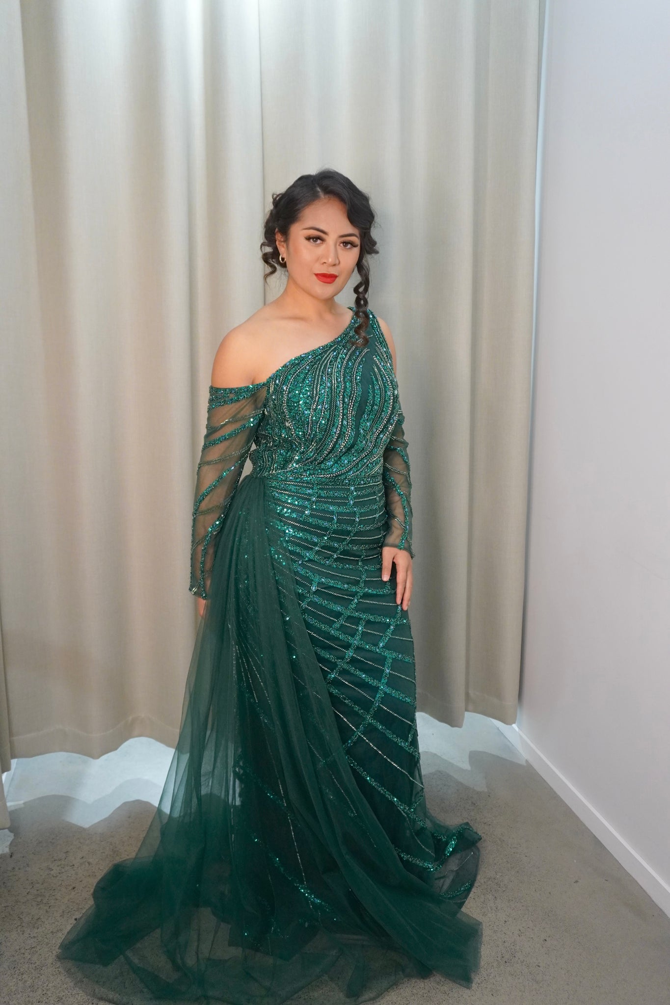 The Audrey dress is a mesmerizing one-shoulder gown adorned with shimmering sequins and intricate beading. Its flowing sheer sleeve adds a touch of elegance, perfect for a standout evening look.