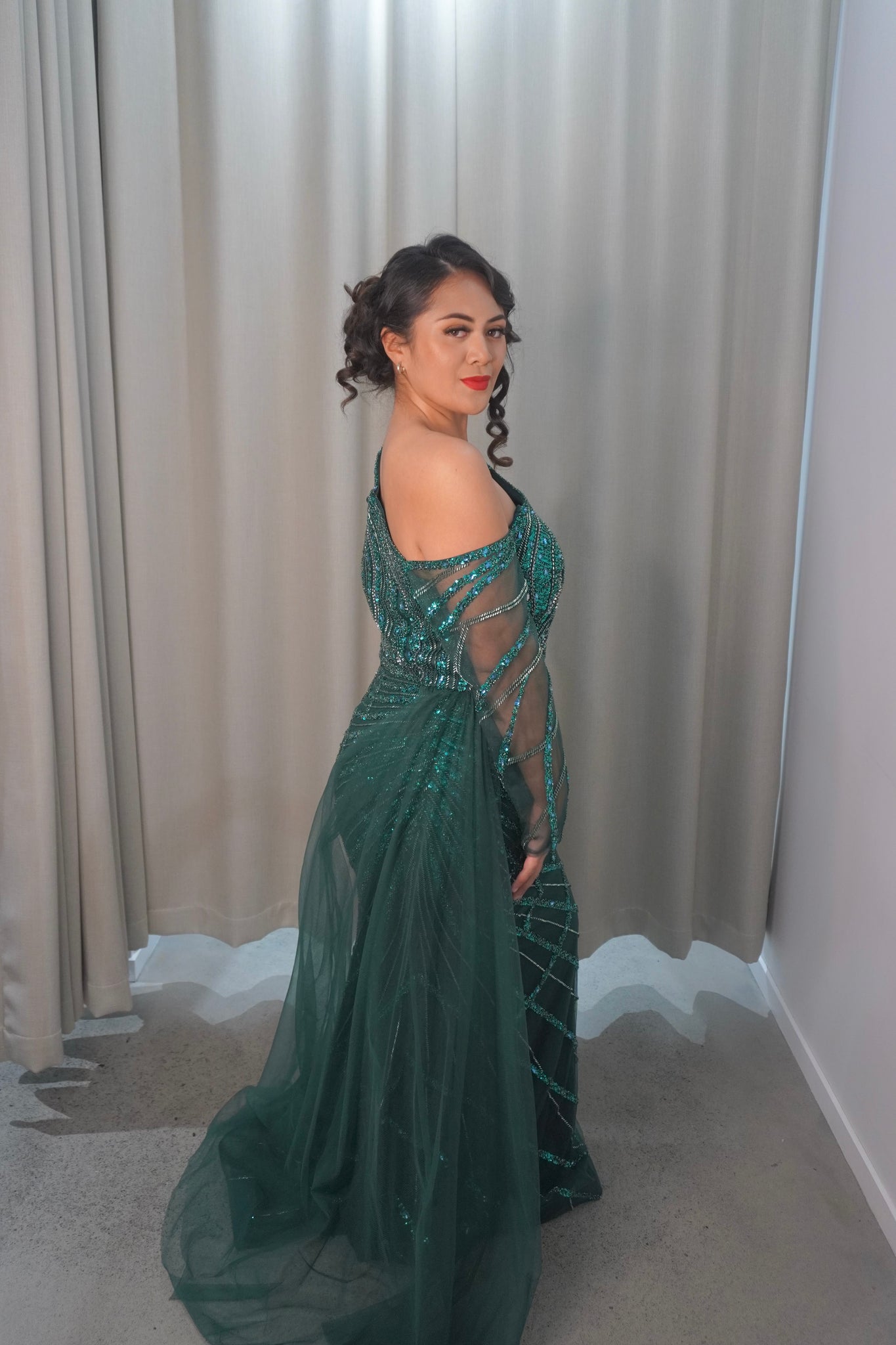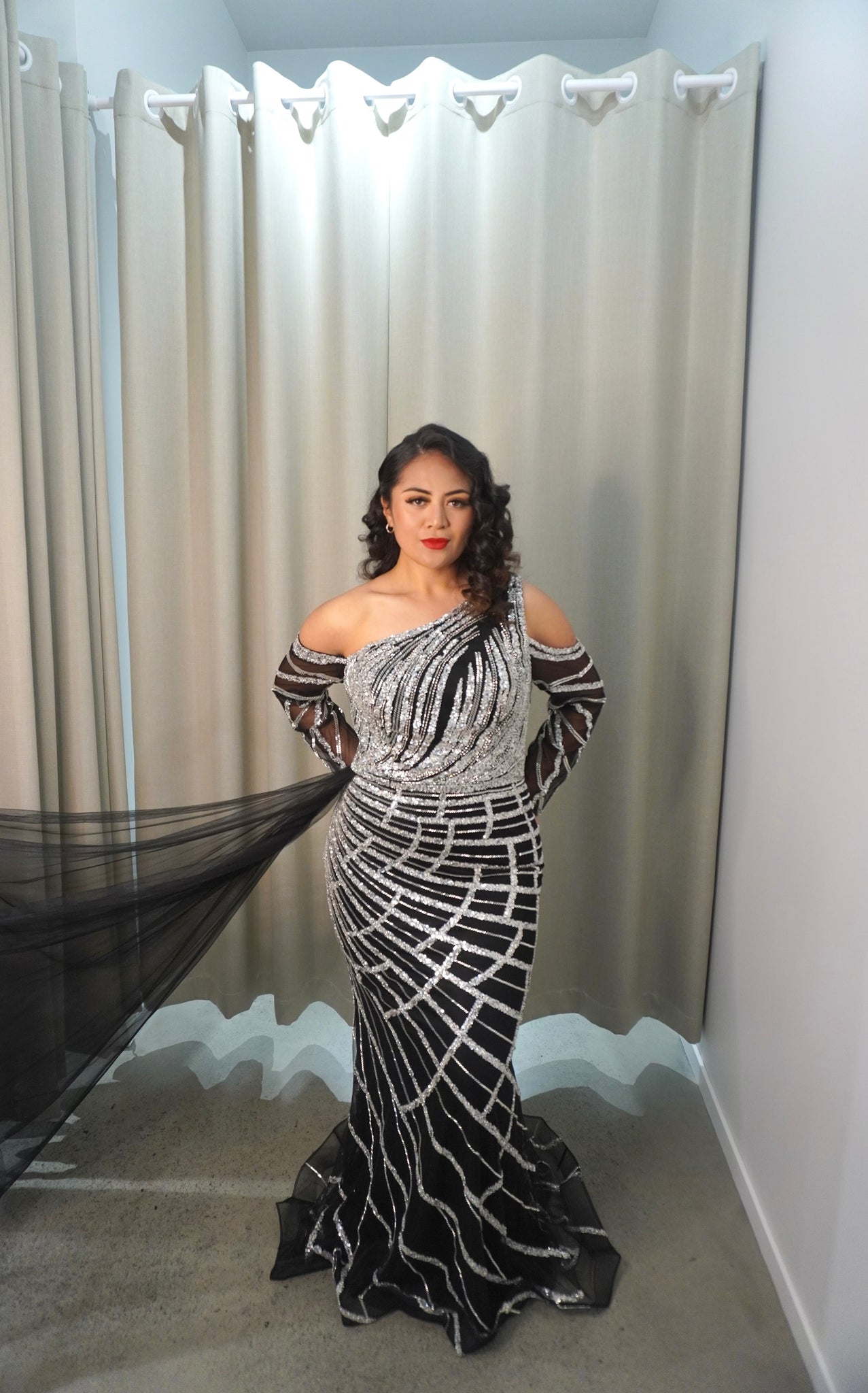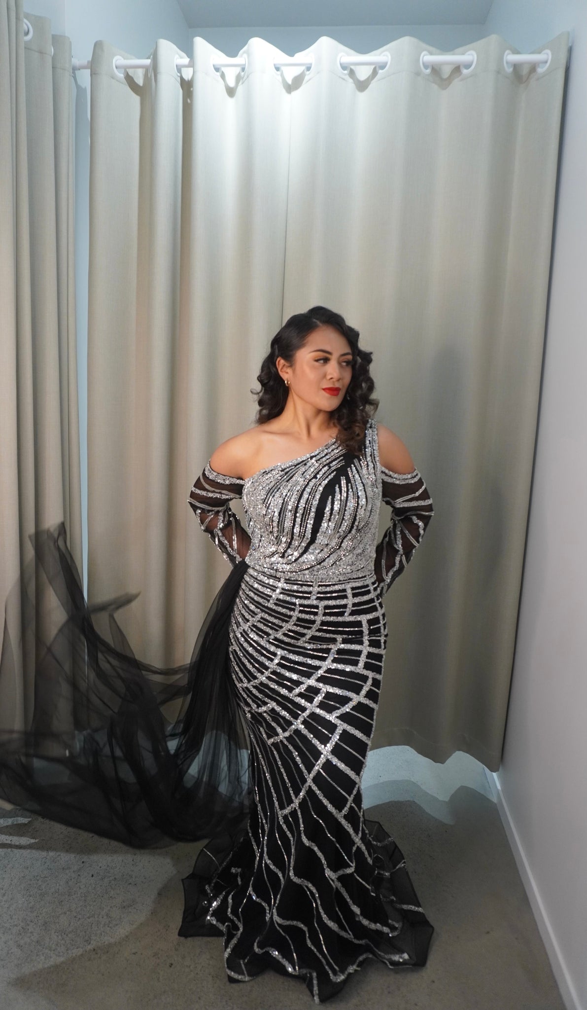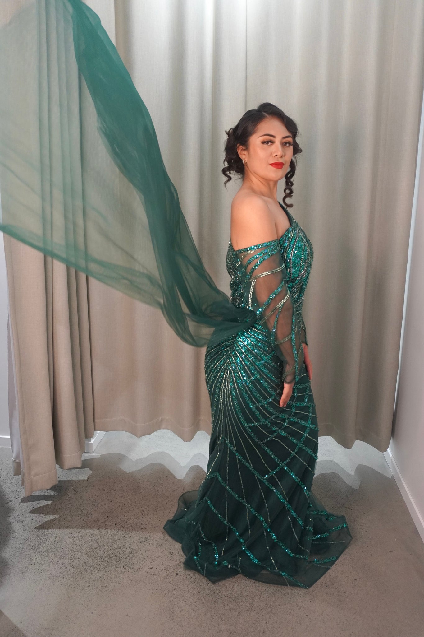 The Audrey dress is a mesmerizing one-shoulder gown adorned with shimmering sequins and intricate beading. Its flowing sheer sleeve adds a touch of elegance, perfect for a standout evening look.