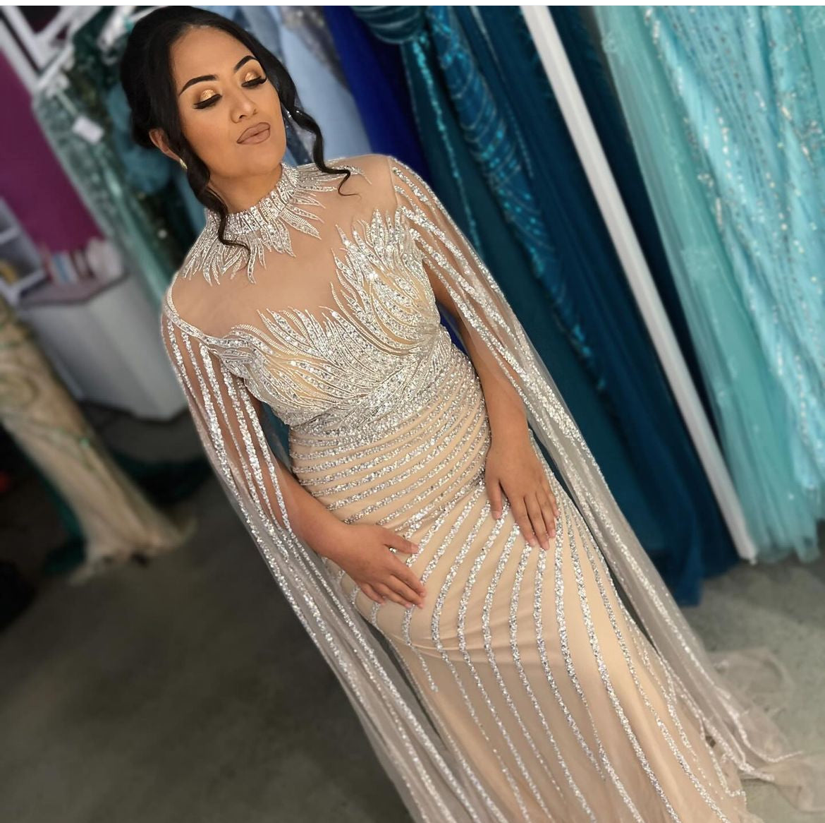 This Bianca dress is a captivating gown featuring a nude base with intricate silver embellishments that create a striking pattern across the bodice and skirt. The high neckline and long, sheer, embellished sleeves add a regal touch, while the cape-like design flowing from the shoulders enhances the overall dramatic effect. The silver detailing cascades in a wave-like pattern, emphasizing the gown's elegant silhouette. This dress is perfect for a formal event where a bold, yet sophisticated statement is desired.