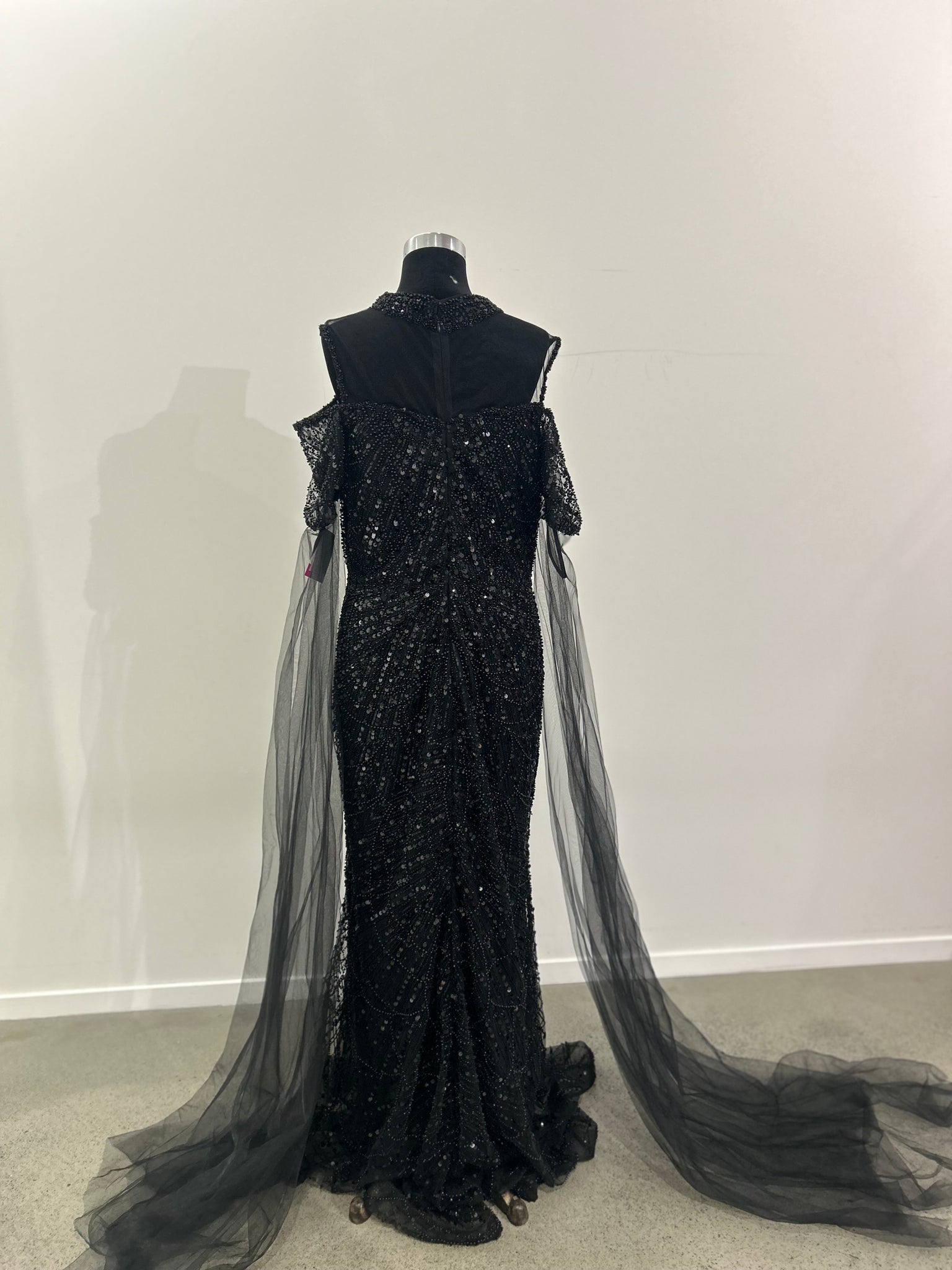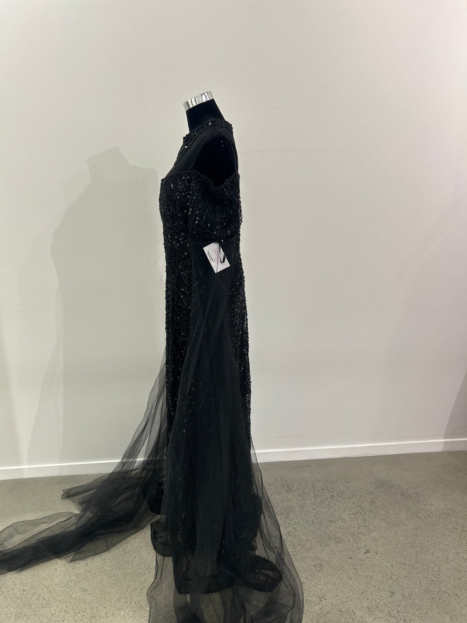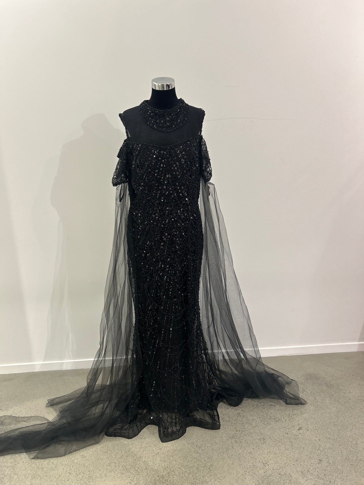 The Camile dress is an exquisite high-neck gown adorned with intricate beading, featuring dramatic sheer sleeves that cascade elegantly. A perfect choice for making a bold and luxurious statement at any formal event.