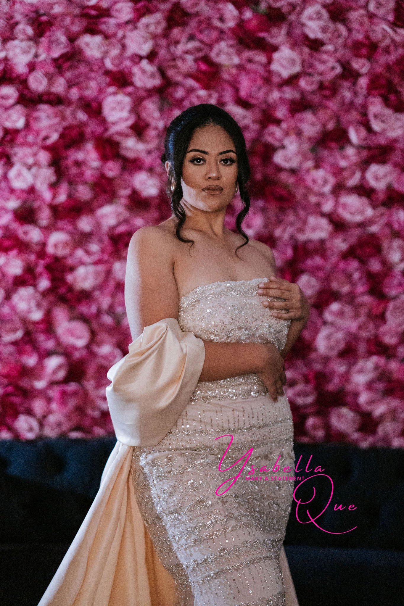This Celeste dress is an elegant strapless gown that exudes luxury and sophistication. It features intricate beaded embroidery across the bodice, adding a touch of sparkle and texture. The gown is form-fitting, accentuating the wearer’s silhouette, and is paired with a matching satin wrap that adds an extra layer of opulence. The combination of the delicate beading and the smooth satin fabric creates a stunning contrast, making this dress perfect for a formal event or a special occasion where making a statement is essential.