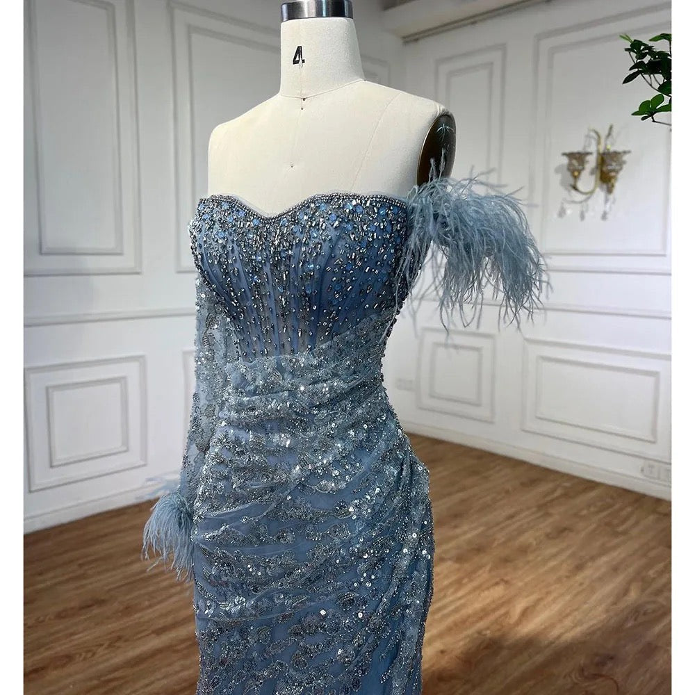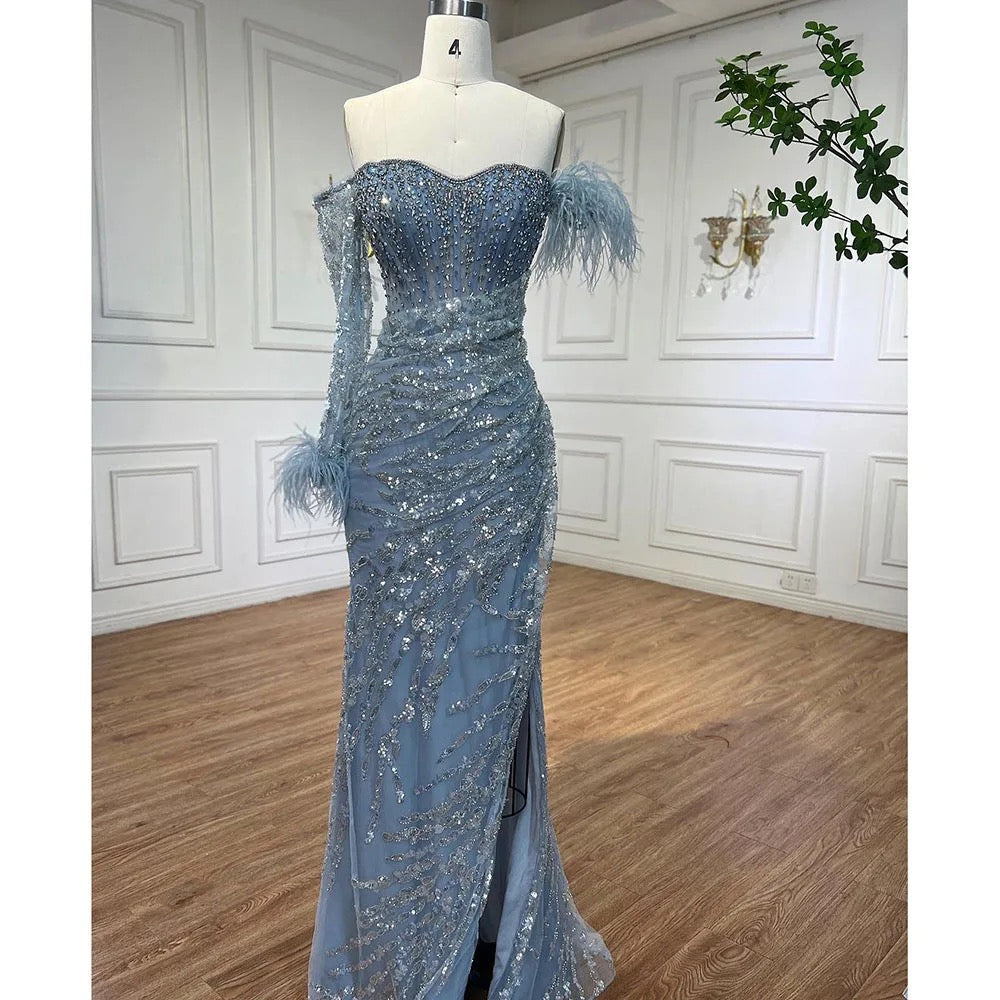 This Elora gown exudes elegance and sophistication, featuring an off-the-shoulder neckline adorned with intricate beading that adds a touch of glamour. The delicate feather accents on the sleeves complement the sparkling embellishments that cascade down the dress, creating a captivating and luxurious look. Perfect for making a statement at any formal event, this gown is a true embodiment of timeless beauty and refined style.