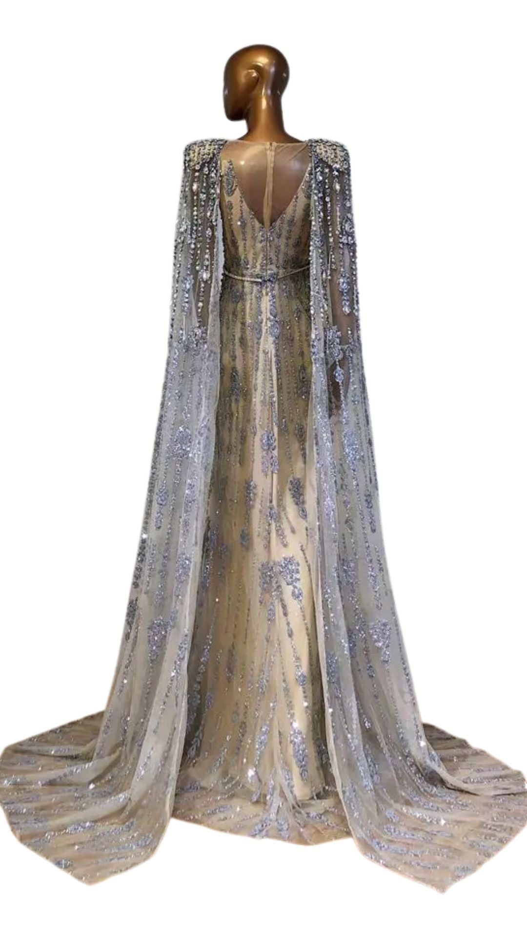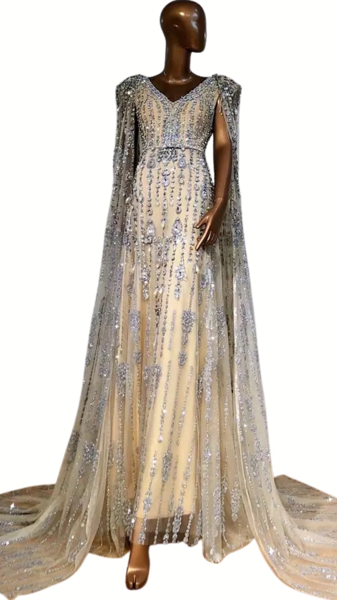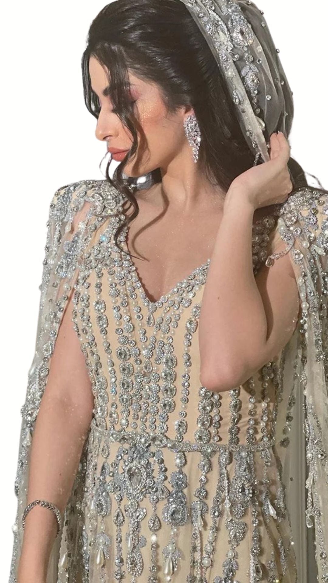 This elegant Fatima gown features a deep V-neckline and is adorned with shimmering silver embellishments that cascade down the bodice and along the sheer cape sleeves. The intricate detailing creates a luxurious and sophisticated look, perfect for a formal event or a bridal occasion. The neutral nude base of the gown complements the sparkling embellishments, making it a versatile piece for various skin tones.