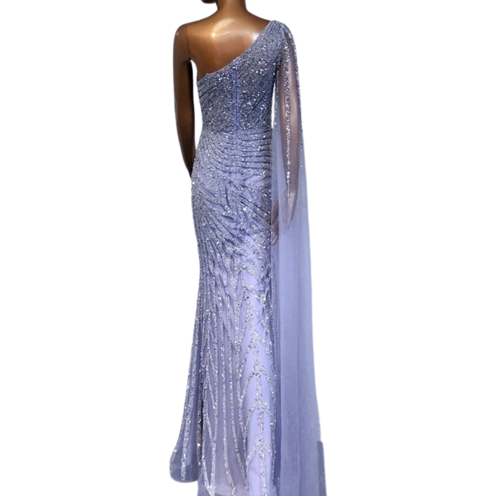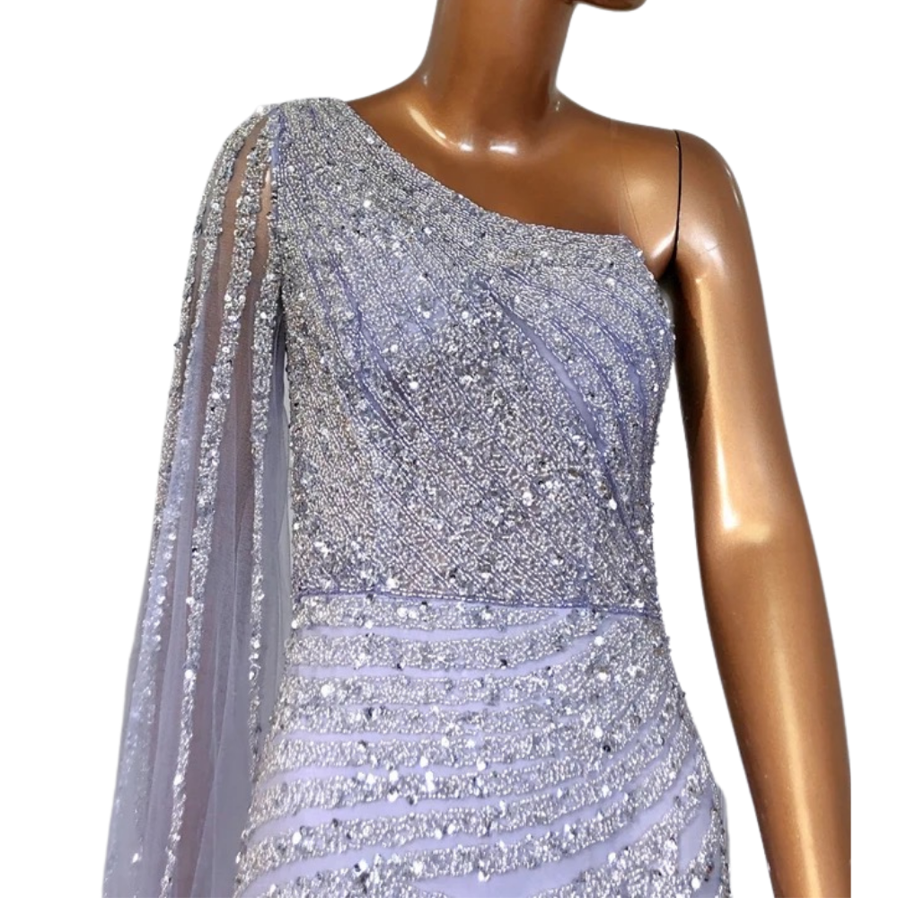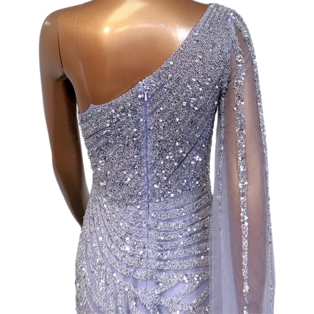 This Hadassah gown exudes modern elegance and sophistication. The one-shoulder design creates a striking silhouette, beautifully accentuating the wearer’s figure. The dress is adorned with shimmering silver sequins arranged in a mesmerizing pattern that enhances its sleek, form-fitting shape. The thigh-high slit adds a touch of allure, while the flowing sheer fabric cascading from the shoulder provides a dramatic, ethereal finish. This gown is perfect for making a glamorous statement at any high-profile event, combining timeless elegance with contemporary flair.