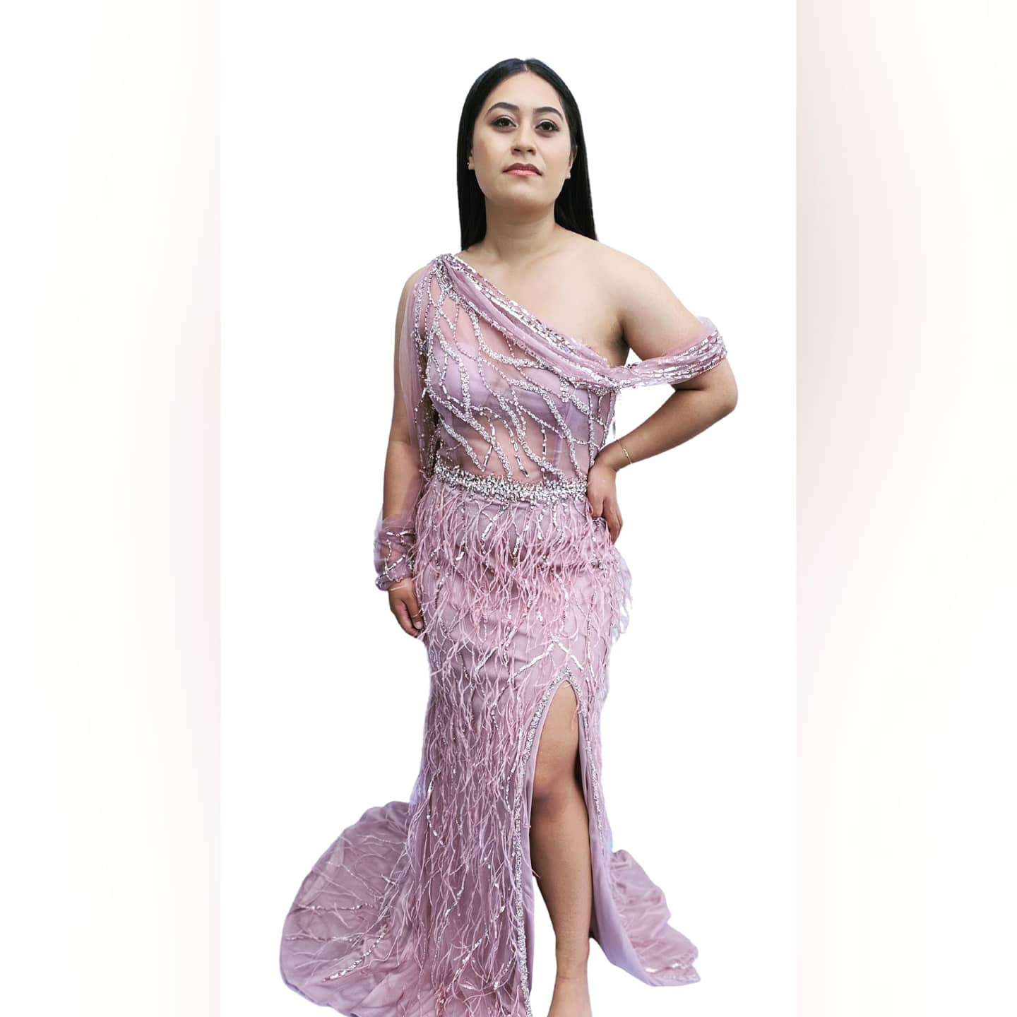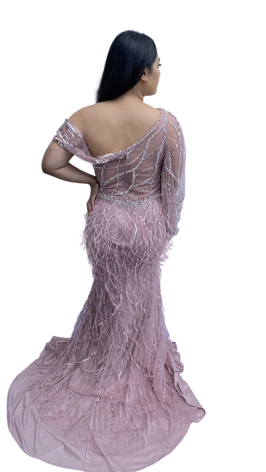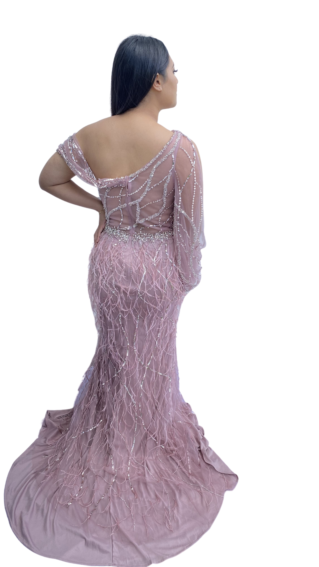 This elegant Islay blush pink gown features a unique one-shoulder design, adorned with shimmering beadwork and sequins that create a stunning, luxurious effect. The gown is beautifully crafted with a fitted bodice and a flowy train that adds drama and sophistication. The intricate detailing along the waistline adds definition, while the thigh-high slit brings a modern touch to this timeless design