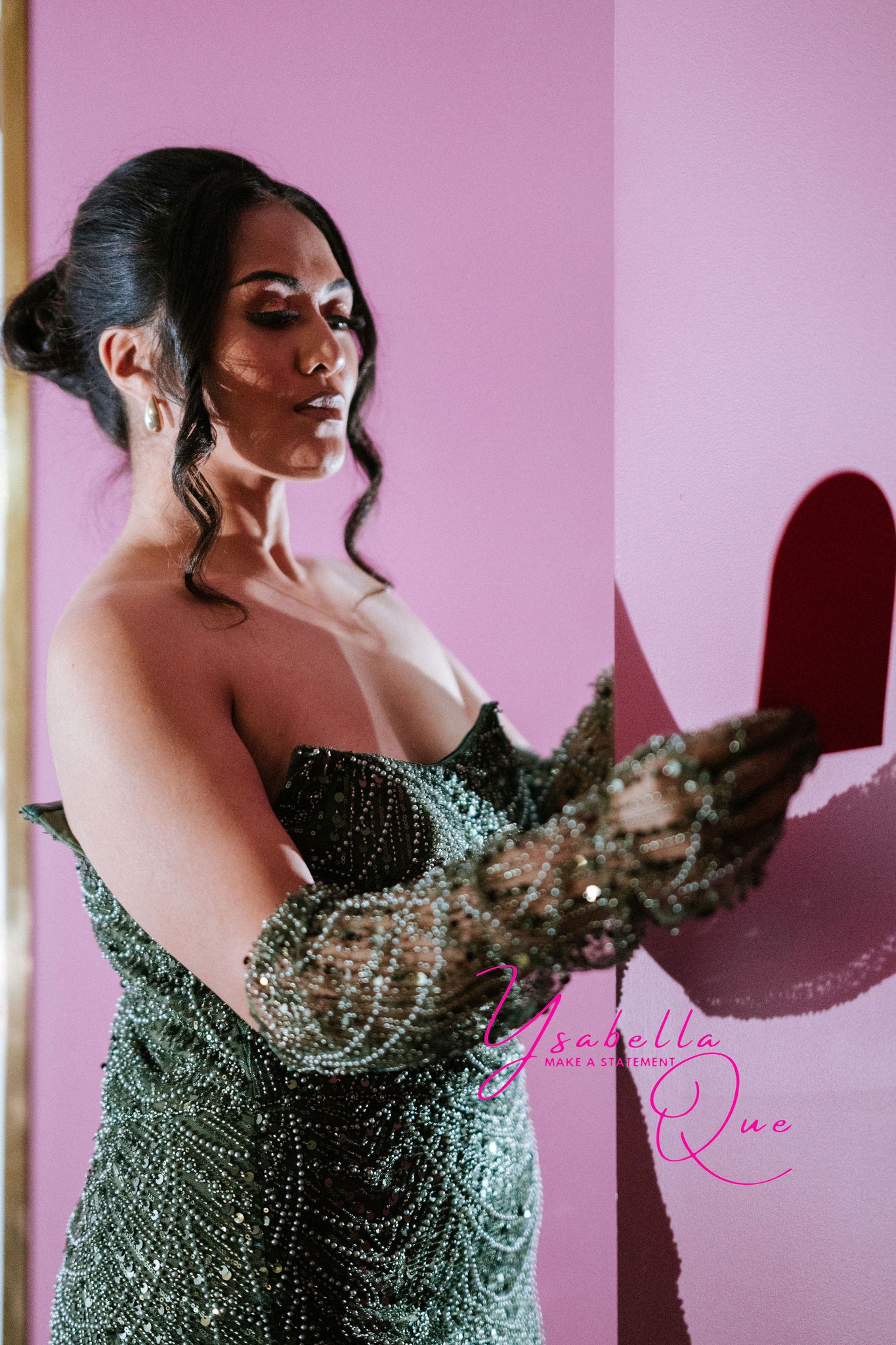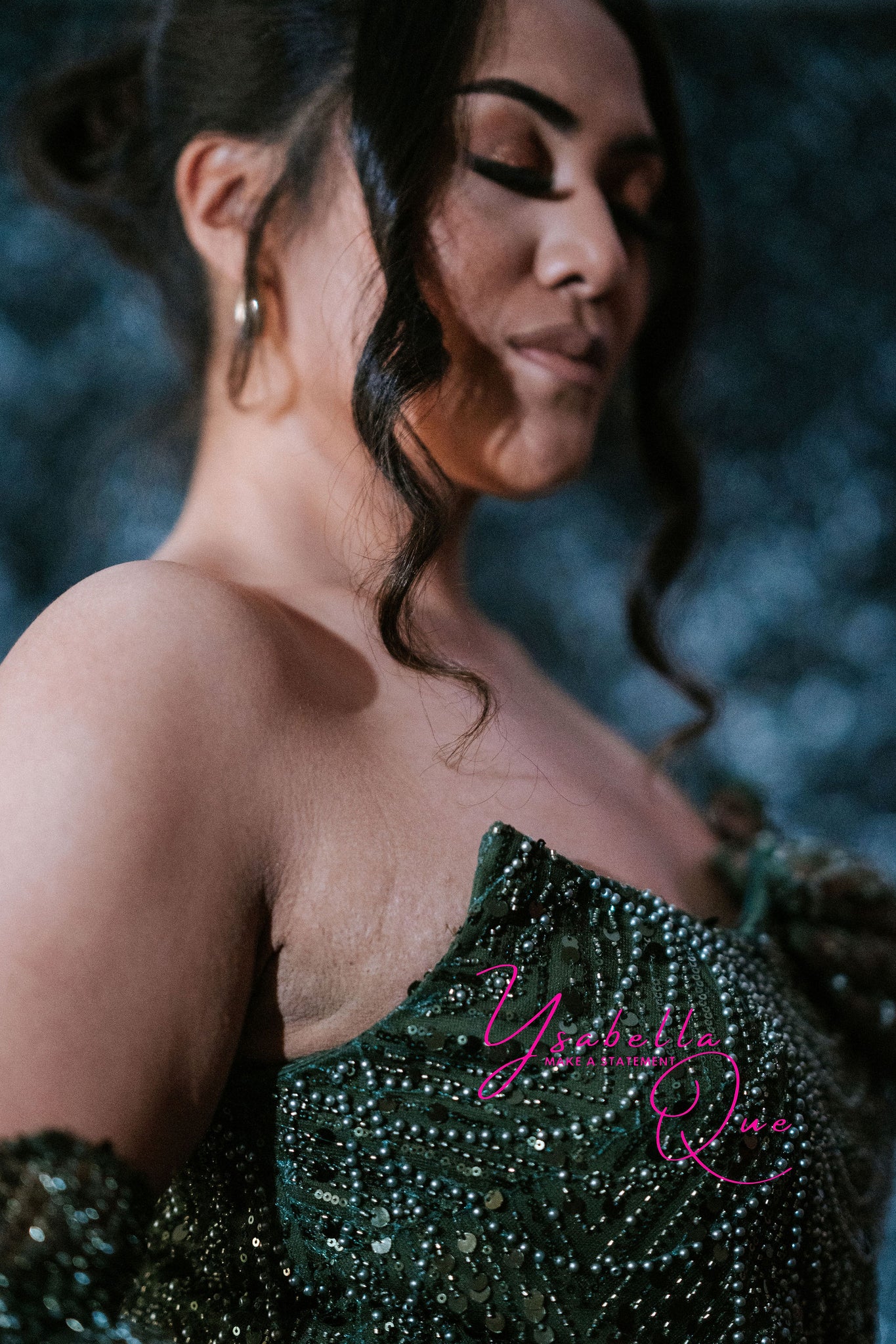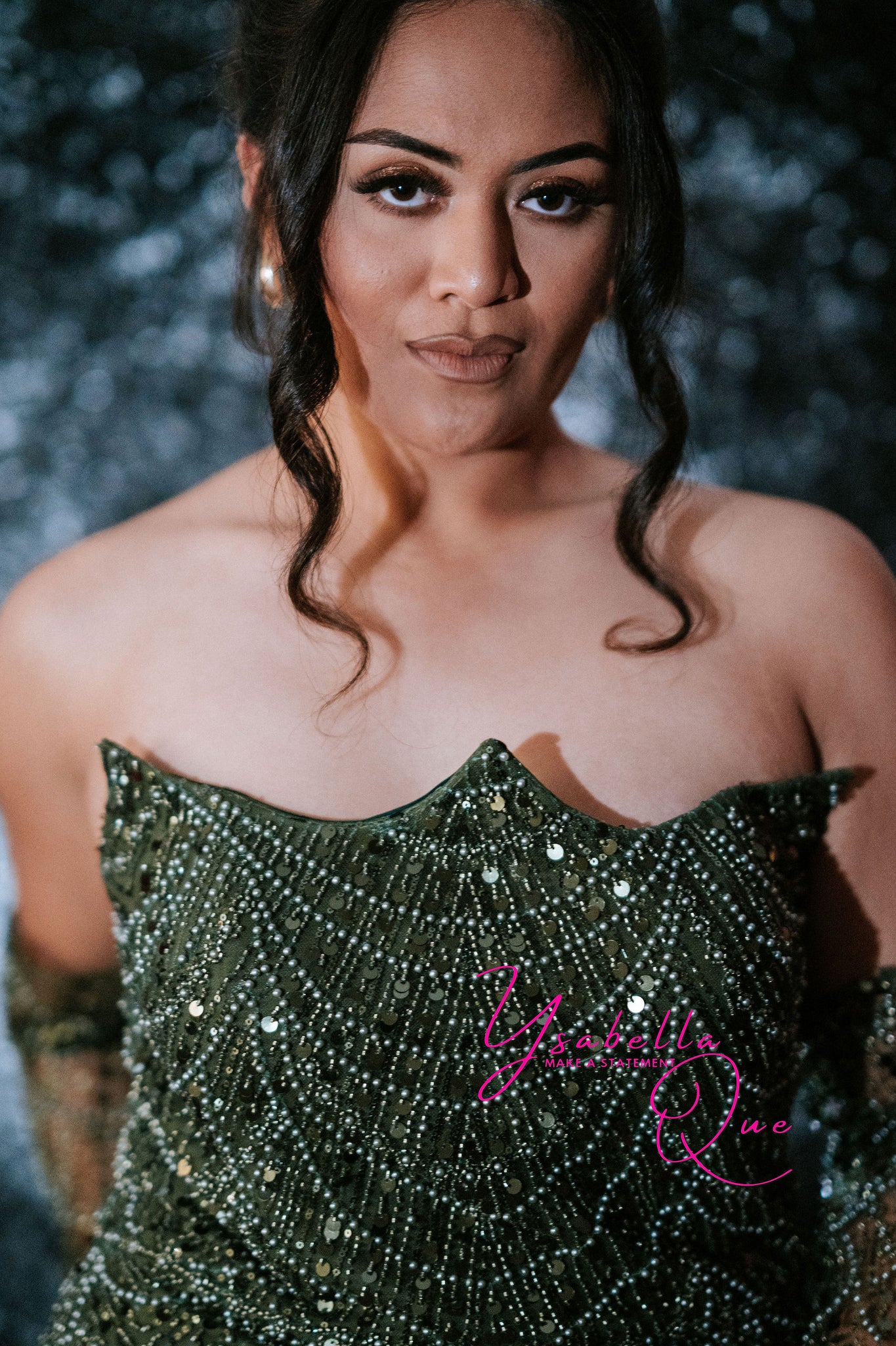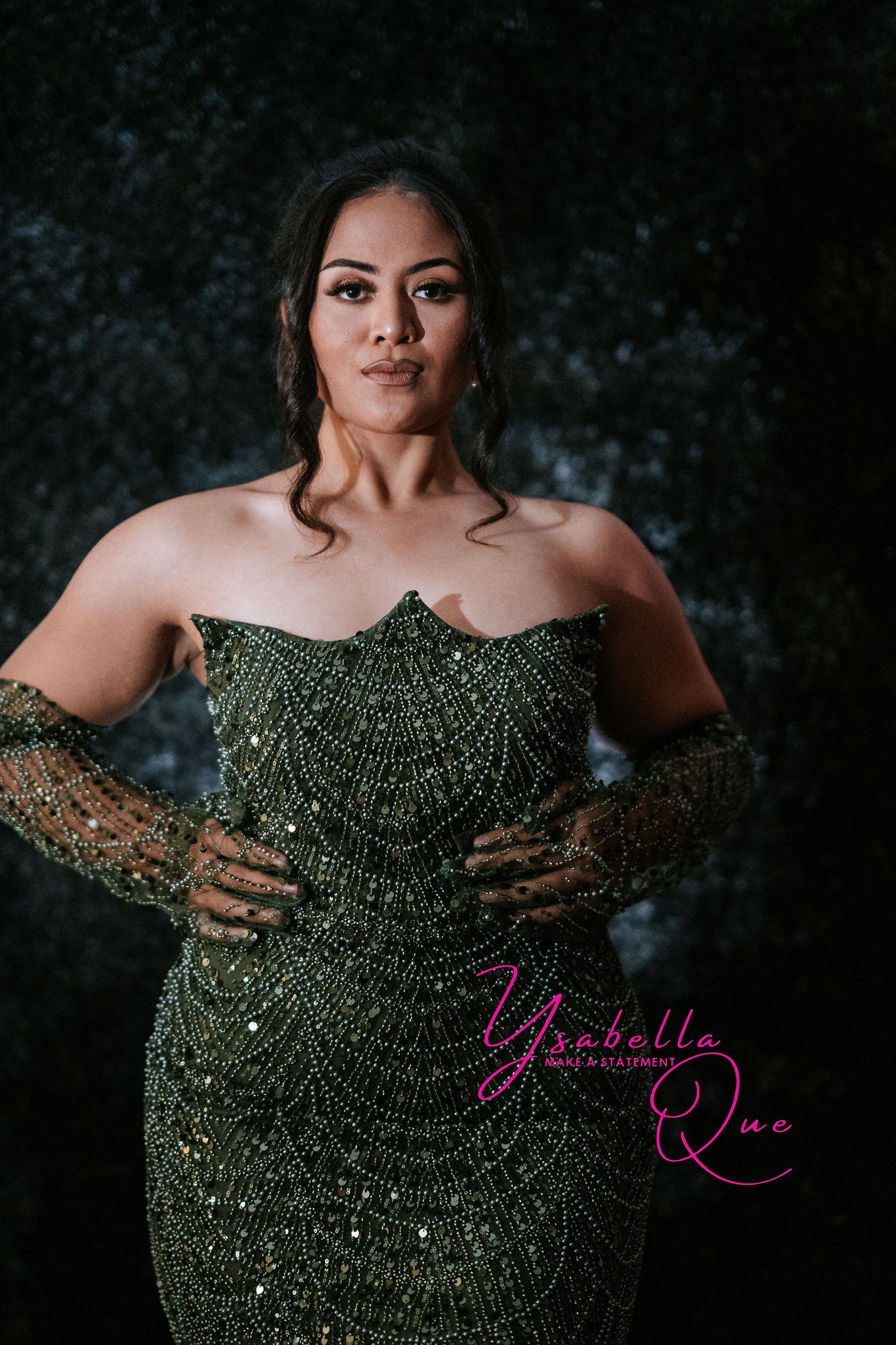 The IVY dress is a strapless, floor-length gown in a rich green color.