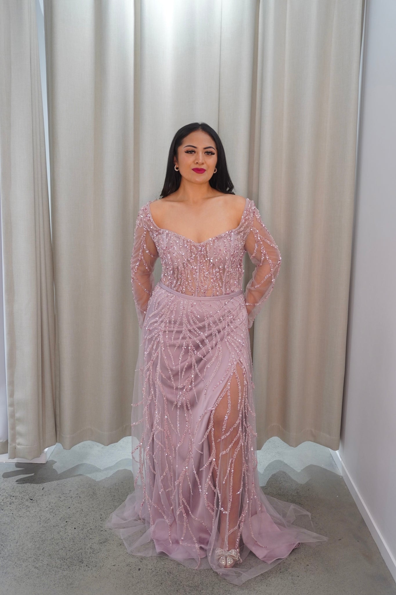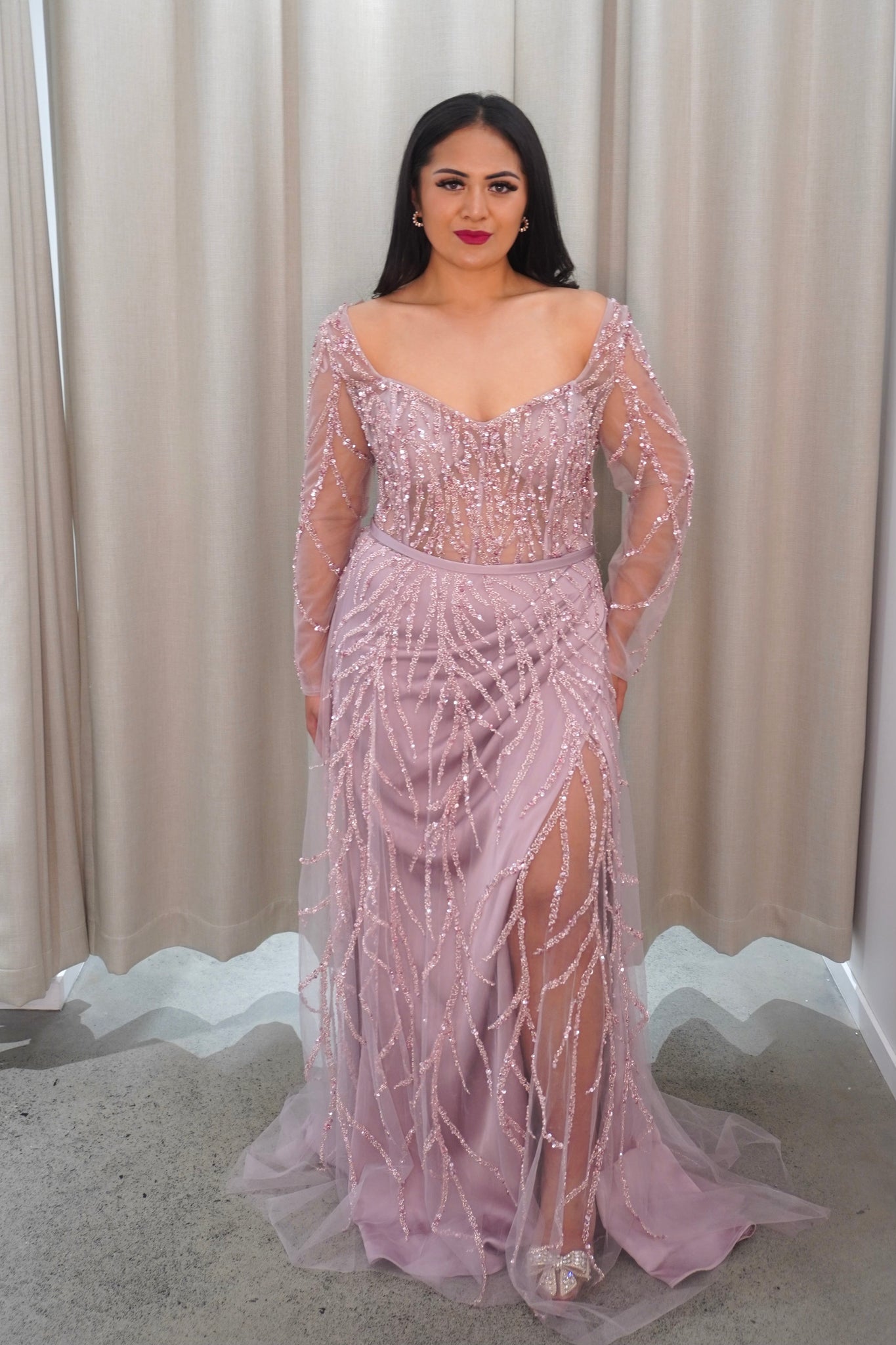 The Jessica dress features intricate beadwork cascading down a soft lavender fabric, offering a blend of elegance and allure. Its sheer long sleeves and thigh-high slit add a touch of modern sophistication.