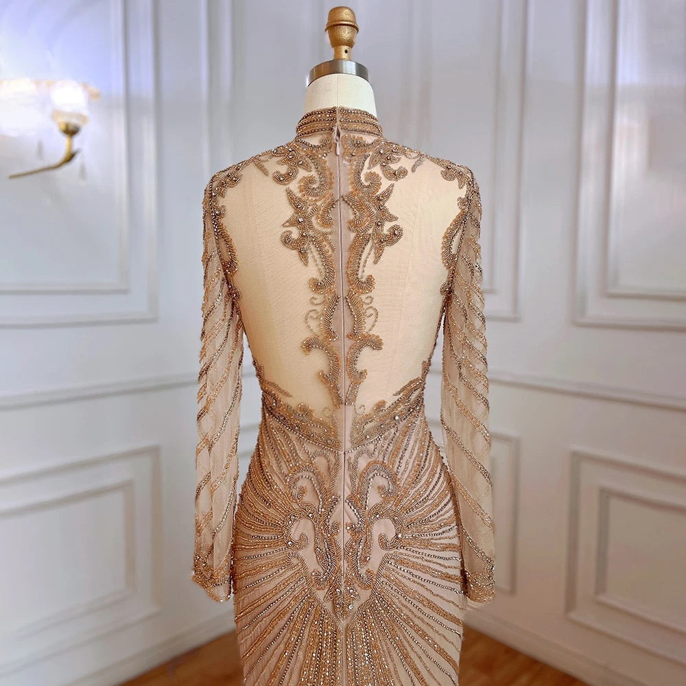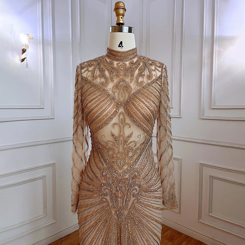 This exquisite Kesha gown is designed to captivate with its intricate beading and elegant high neckline. The fitted silhouette accentuates your curves, while the sheer detailing adds a touch of allure. Perfect for a glamorous evening event, this gown is a statement of sophistication and style.