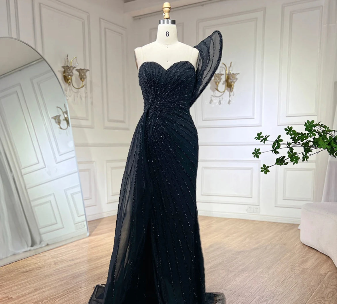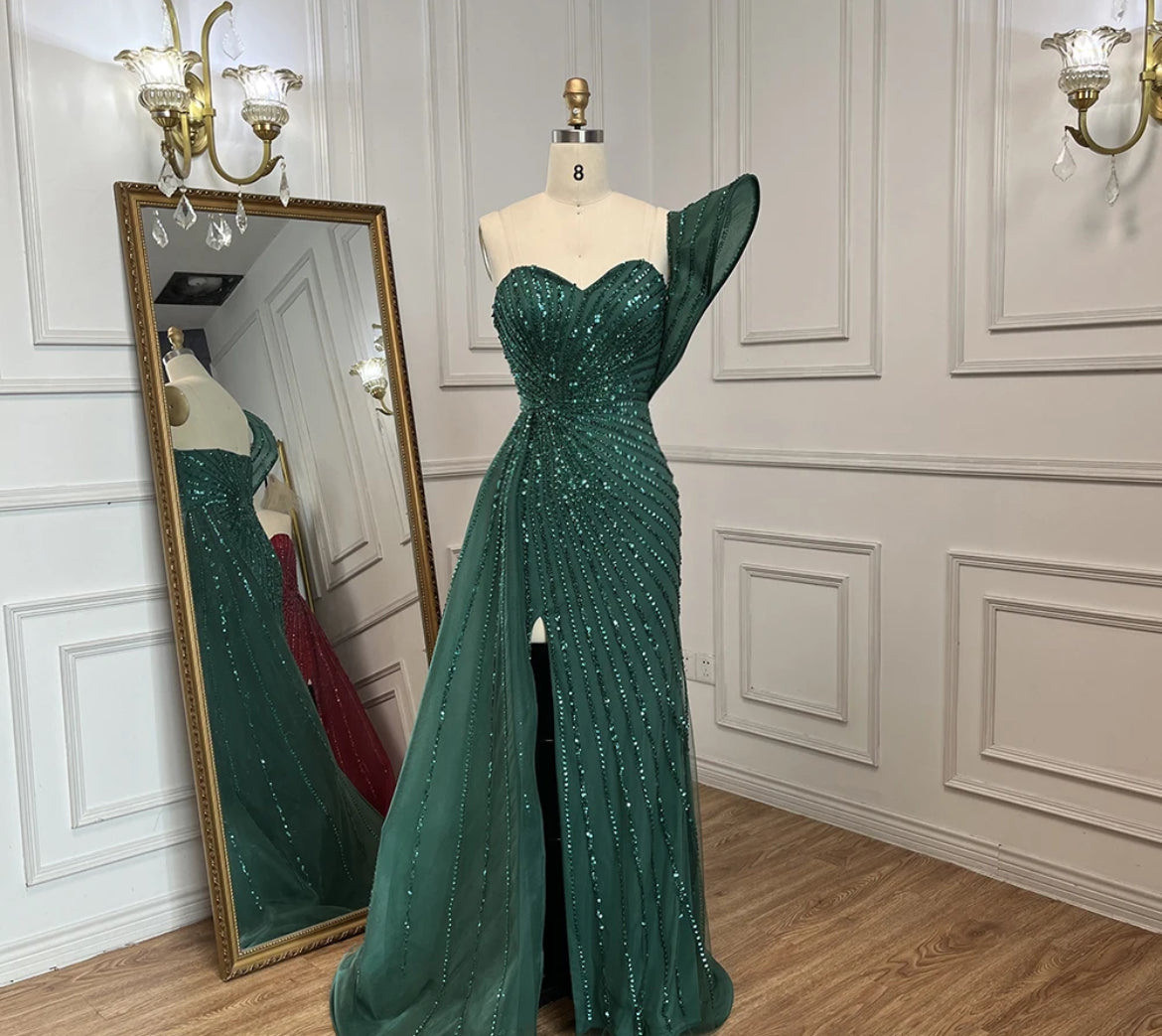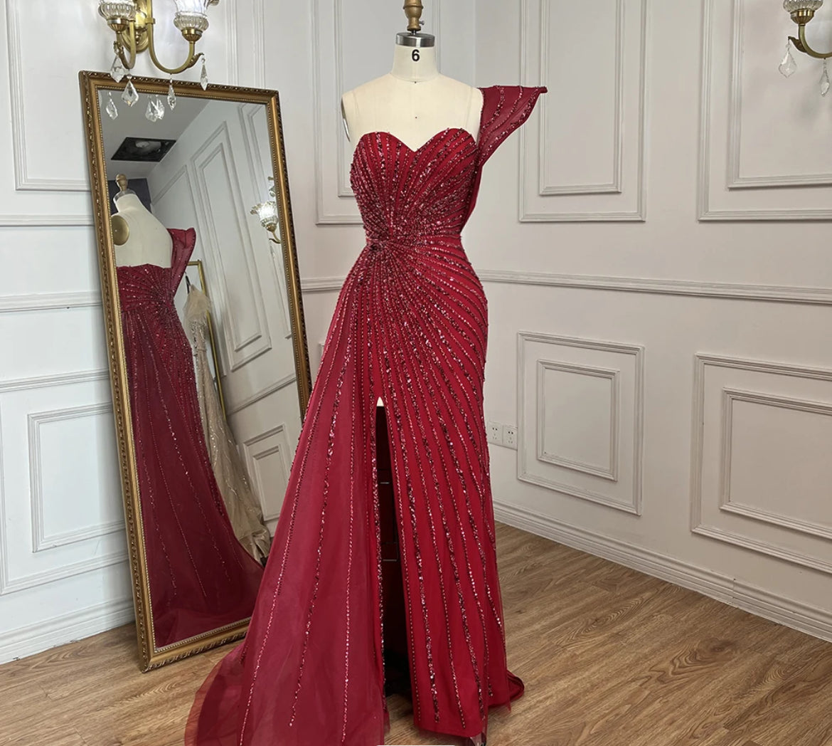 This stunning Liliana red gown is designed with a one-shoulder style that adds a touch of drama and elegance. The bodice is intricately embellished with sequins arranged in a radiating pattern, creating a dynamic and eye-catching effect. The dress features a thigh-high slit, adding a modern and bold twist to the classic silhouette. The structured design and rich red color make this gown a perfect choice for a formal event where you want to make a statement.