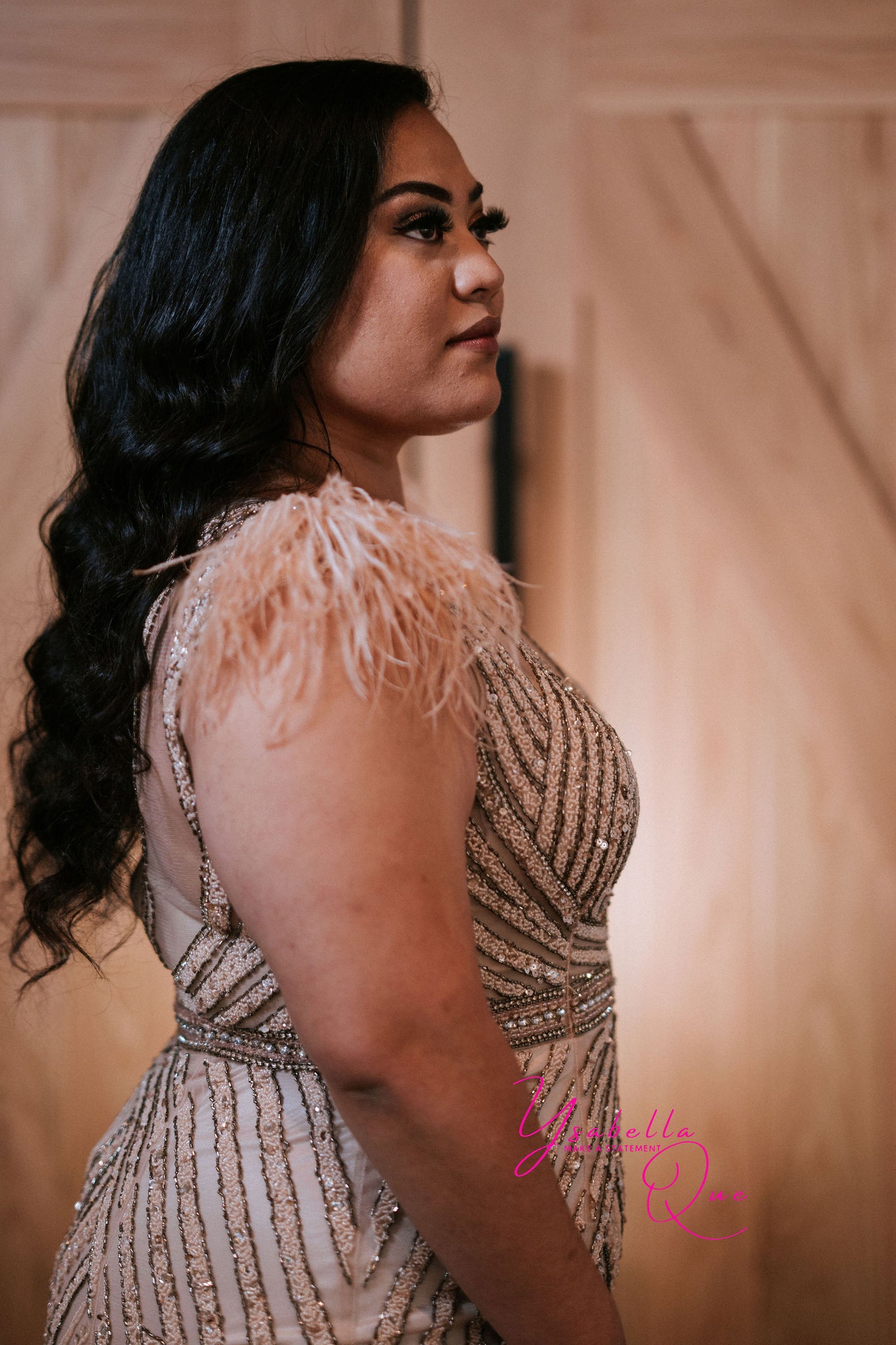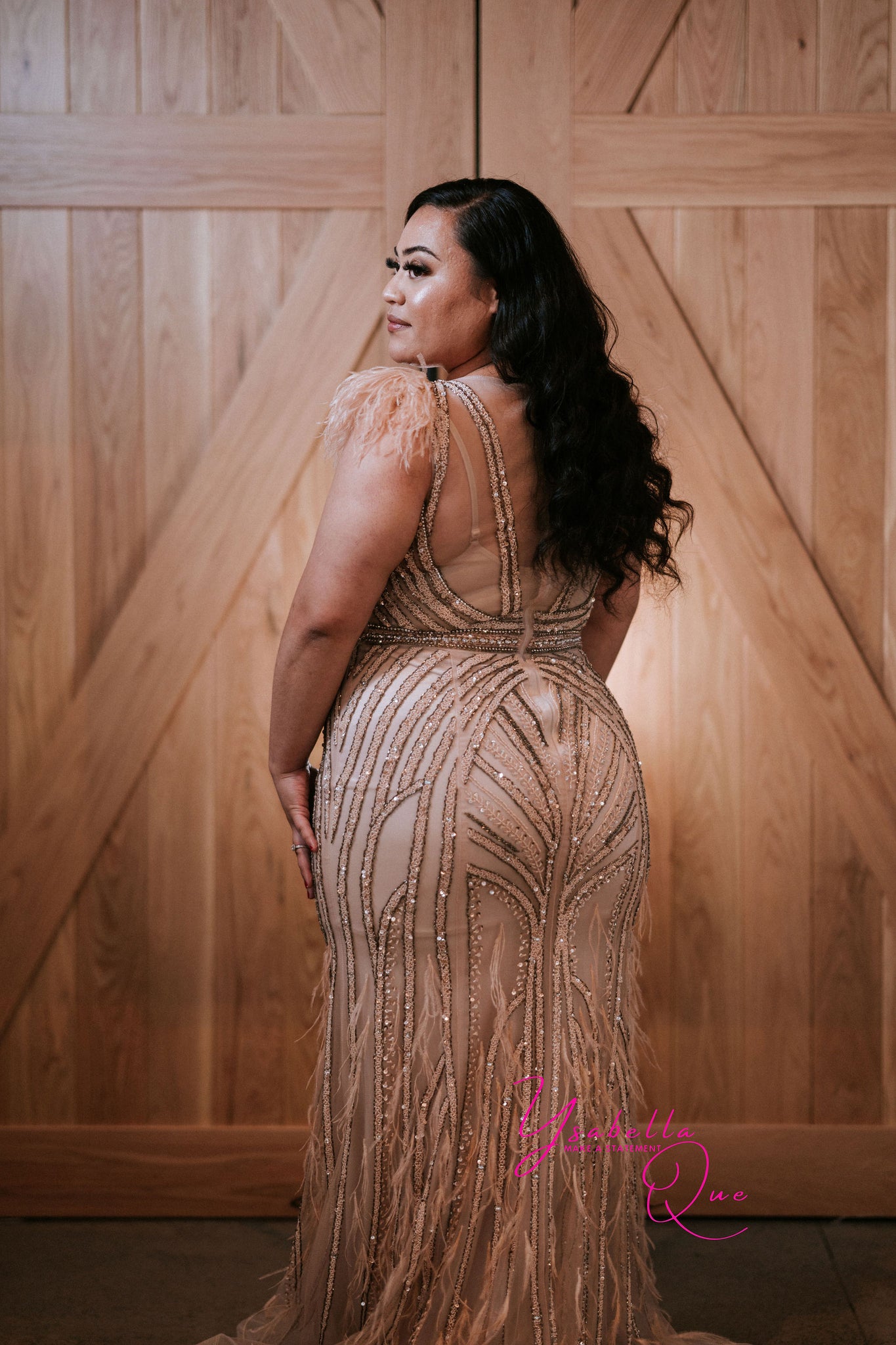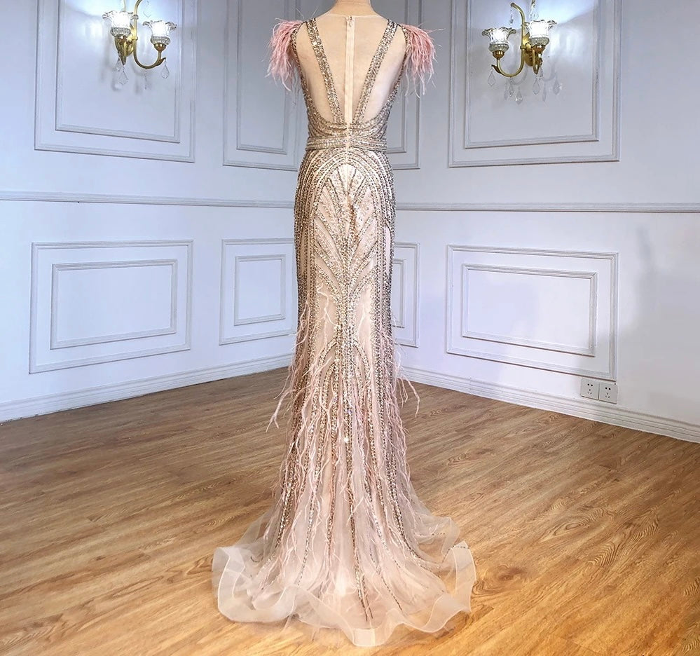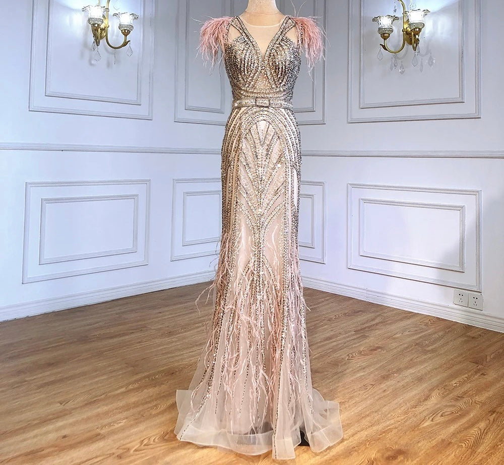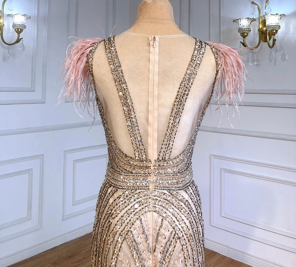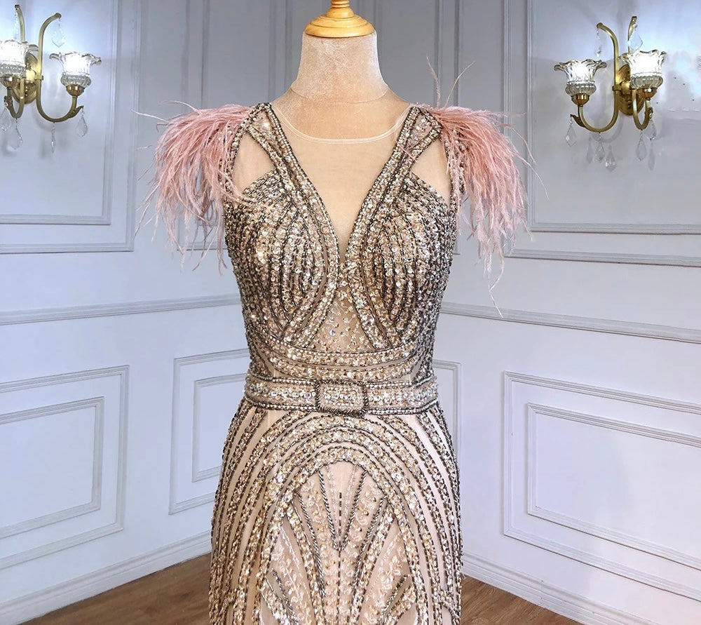 The Mariella dress is a floor-length gown that features intricate beadwork in an art deco-inspired pattern. The gown is designed with a plunging V-neckline and delicate, feathered cap sleeves that add a touch of whimsy and elegance. The beading extends throughout the dress, creating a stunning visual effect that shimmers with every movement. The gown has a fitted silhouette that flows into a sheer, beaded skirt with soft feather-like embellishments at the bottom, giving it a sophisticated and glamorous finish. This dress is perfect for making a grand entrance at any formal event.