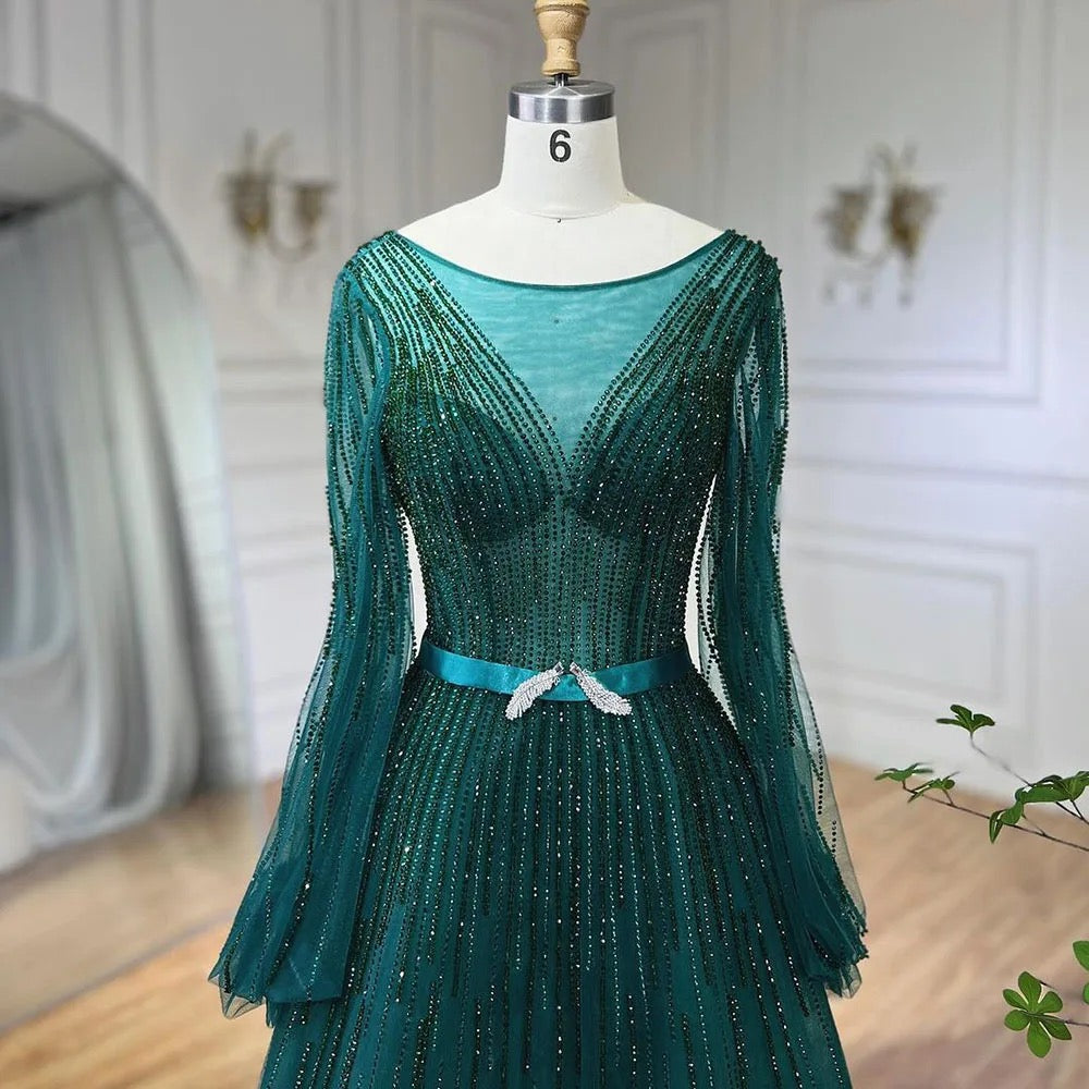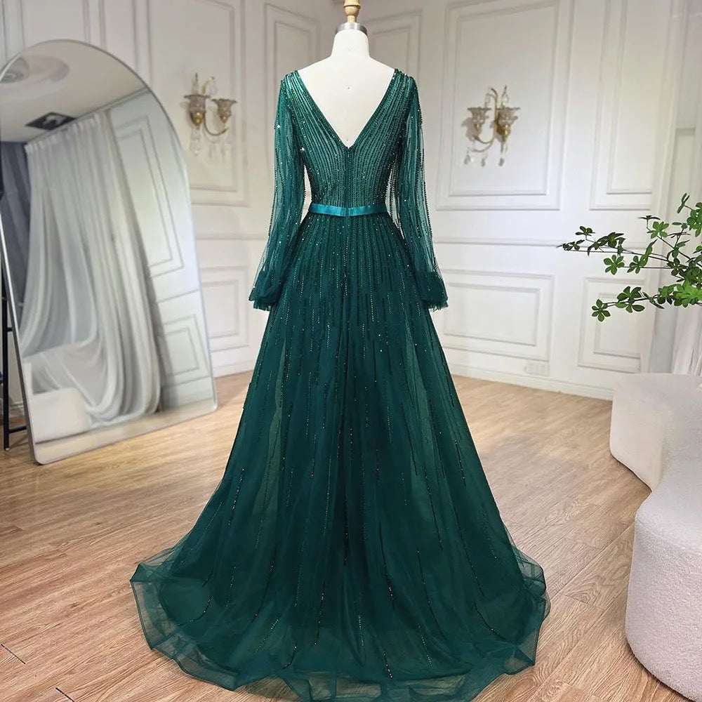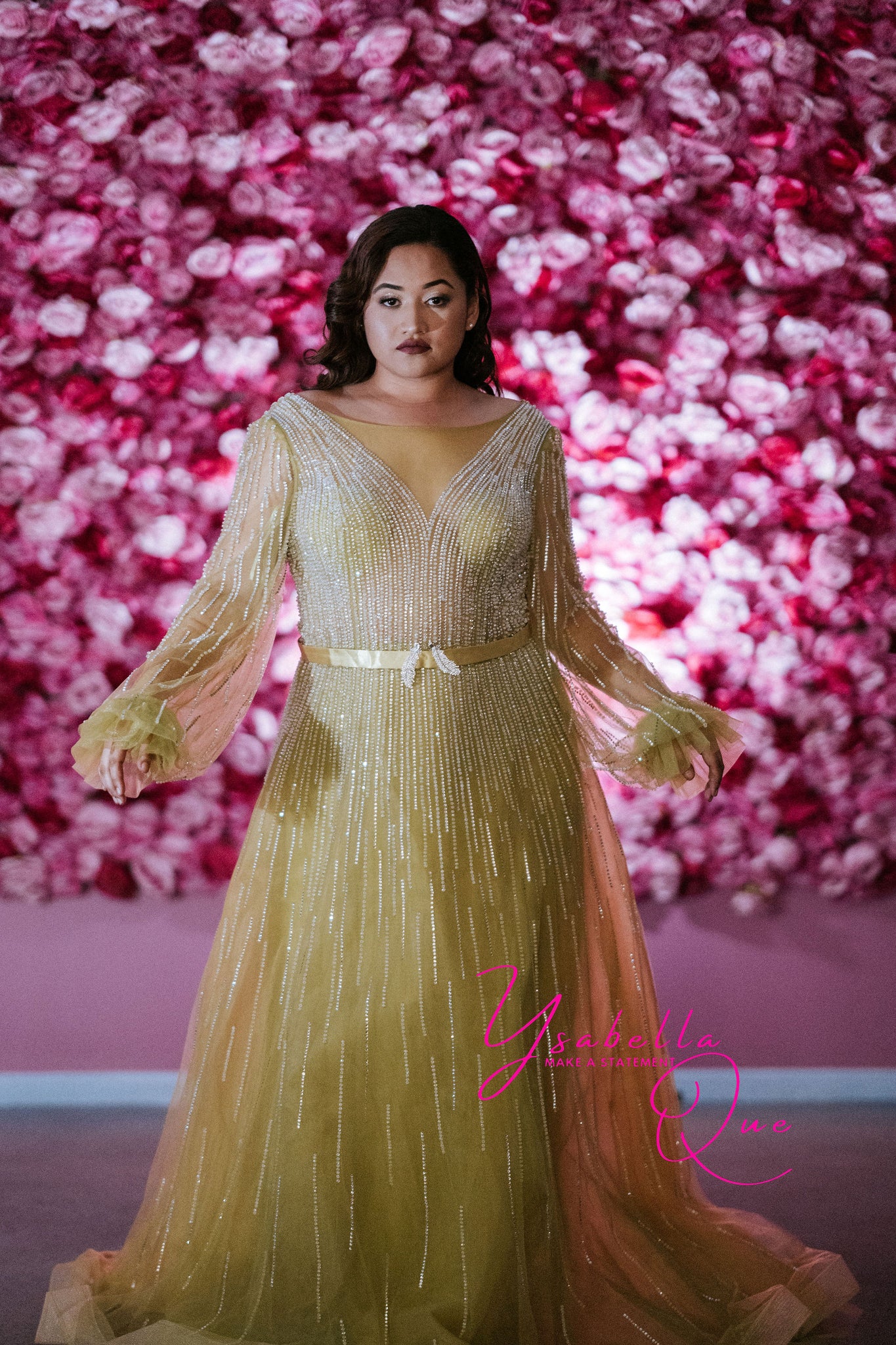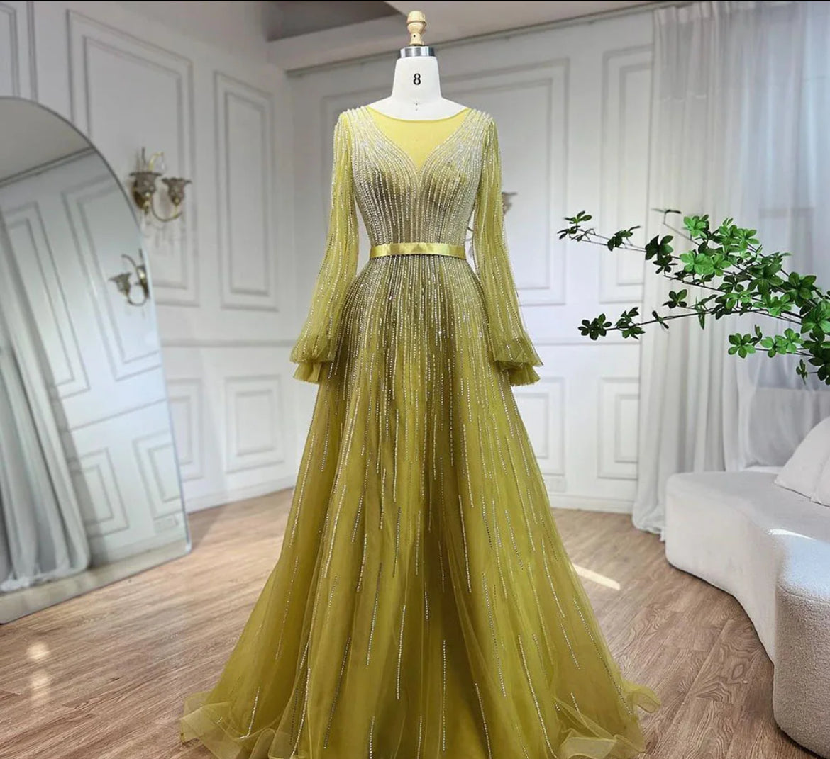 The Monet dress is a graceful mustard yellow gown adorned with delicate beadwork, featuring a deep V-neckline and flowing sheer sleeves. Its ethereal design exudes timeless elegance, perfect for making a luminous entrance.