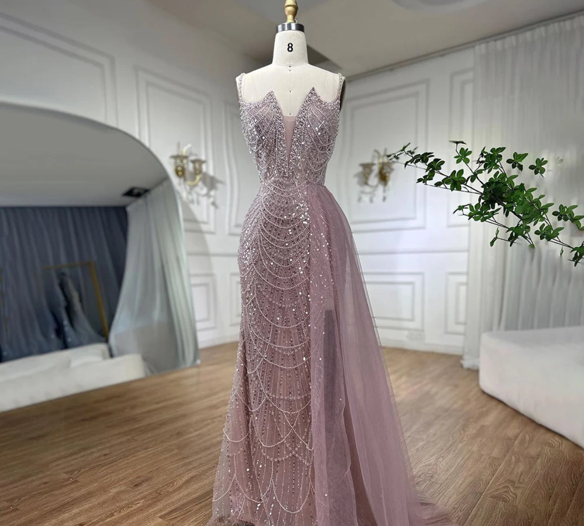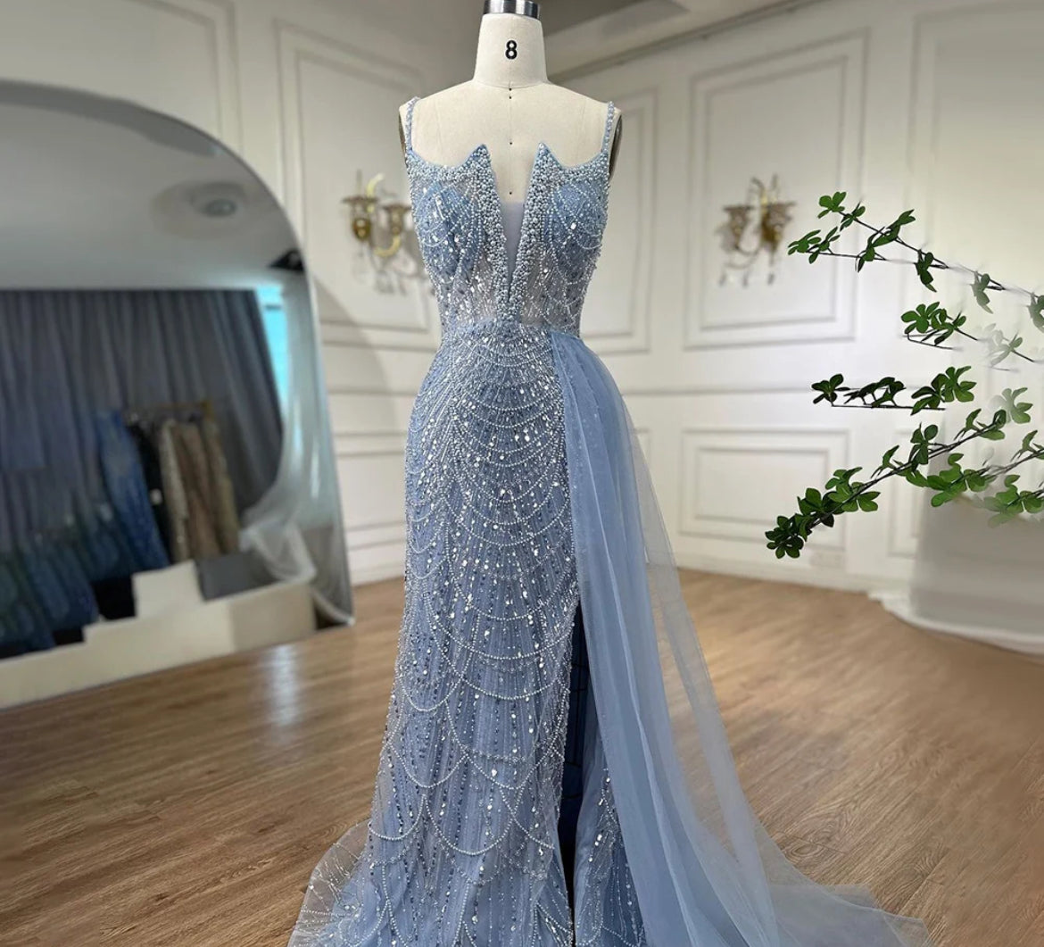 This stunning Naya gown exudes elegance and sophistication, perfect for a formal event or a special occasion. The intricate beadwork cascades down the bodice, creating a beautiful, shimmering effect that catches the light with every movement. The deep neckline is both daring and refined, adding a modern touch to the classic silhouette. The delicate sheer overlay adds a soft, romantic feel to the overall design, while the thigh-high slit ensures a striking and memorable appearance.