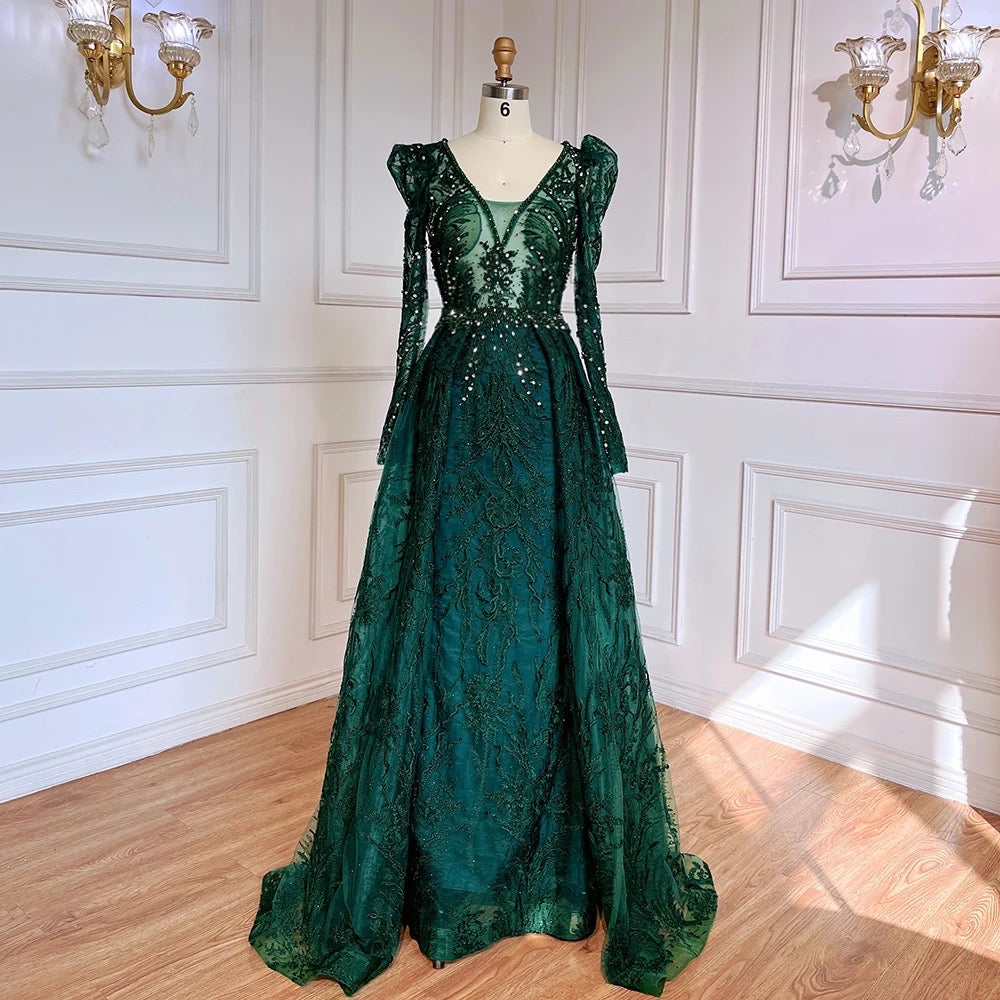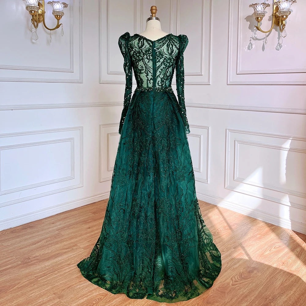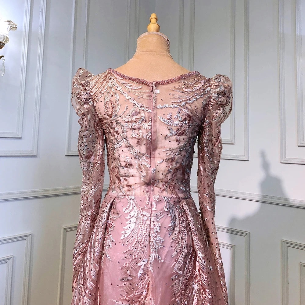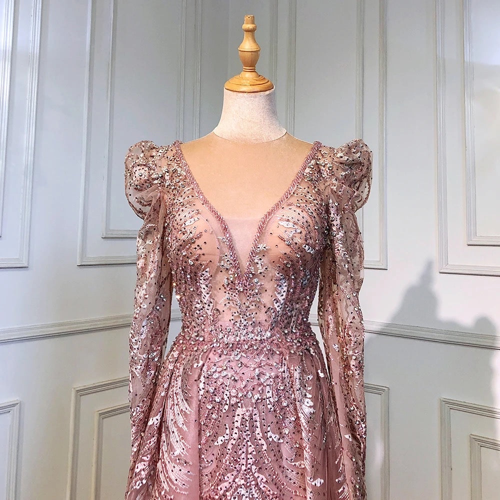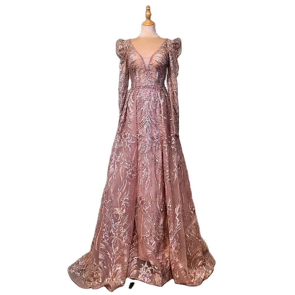 This Pipa dress is a regal, floor-length gown in a soft blush pink color. It features a deep V-neckline and long sleeves with slightly puffed shoulders, giving it a vintage-inspired elegance. The gown is adorned with intricate lace and beaded embroidery that creates a luxurious, textured appearance. The full, A-line skirt flows gracefully, adding volume and movement to the dress. This gown is perfect for a formal event or special occasion where timeless sophistication is key.