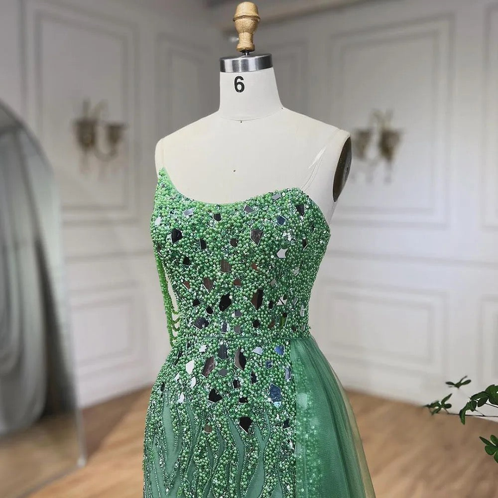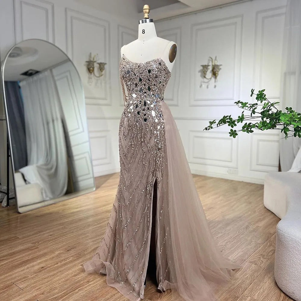 This Phoebe gown is adorned with sparkling embellishments and mirror accents that catch the light beautifully. The dress has delicate spaghetti straps and a flattering scoop neckline. The bodice and skirt are intricately detailed with beadwork that forms elegant patterns, and the skirt includes a high slit that adds a sultry touch. A soft tulle sash drapes from the waist, adding dimension and movement to the dress, which is completed by a subtle train.