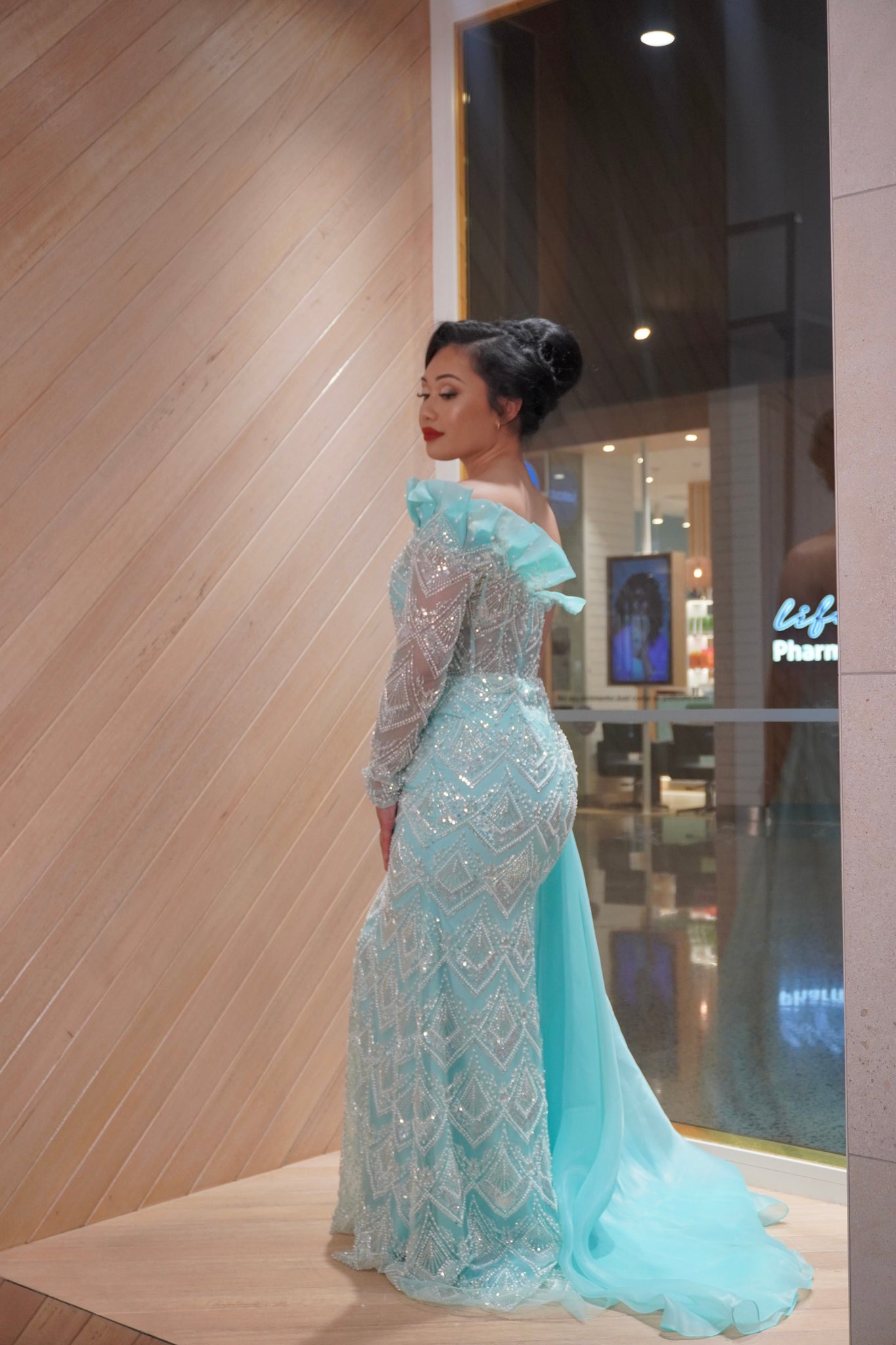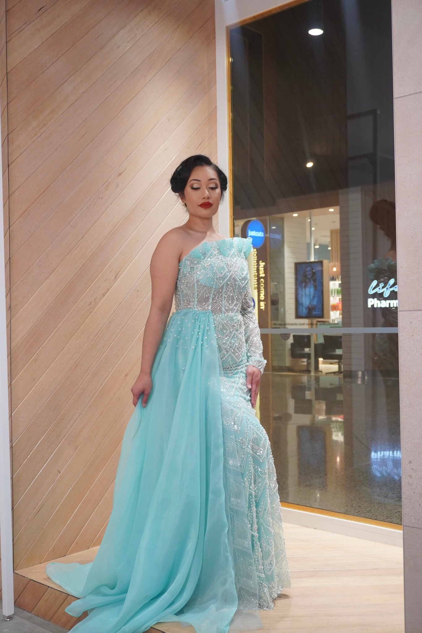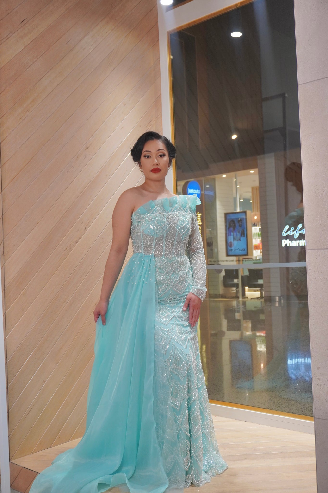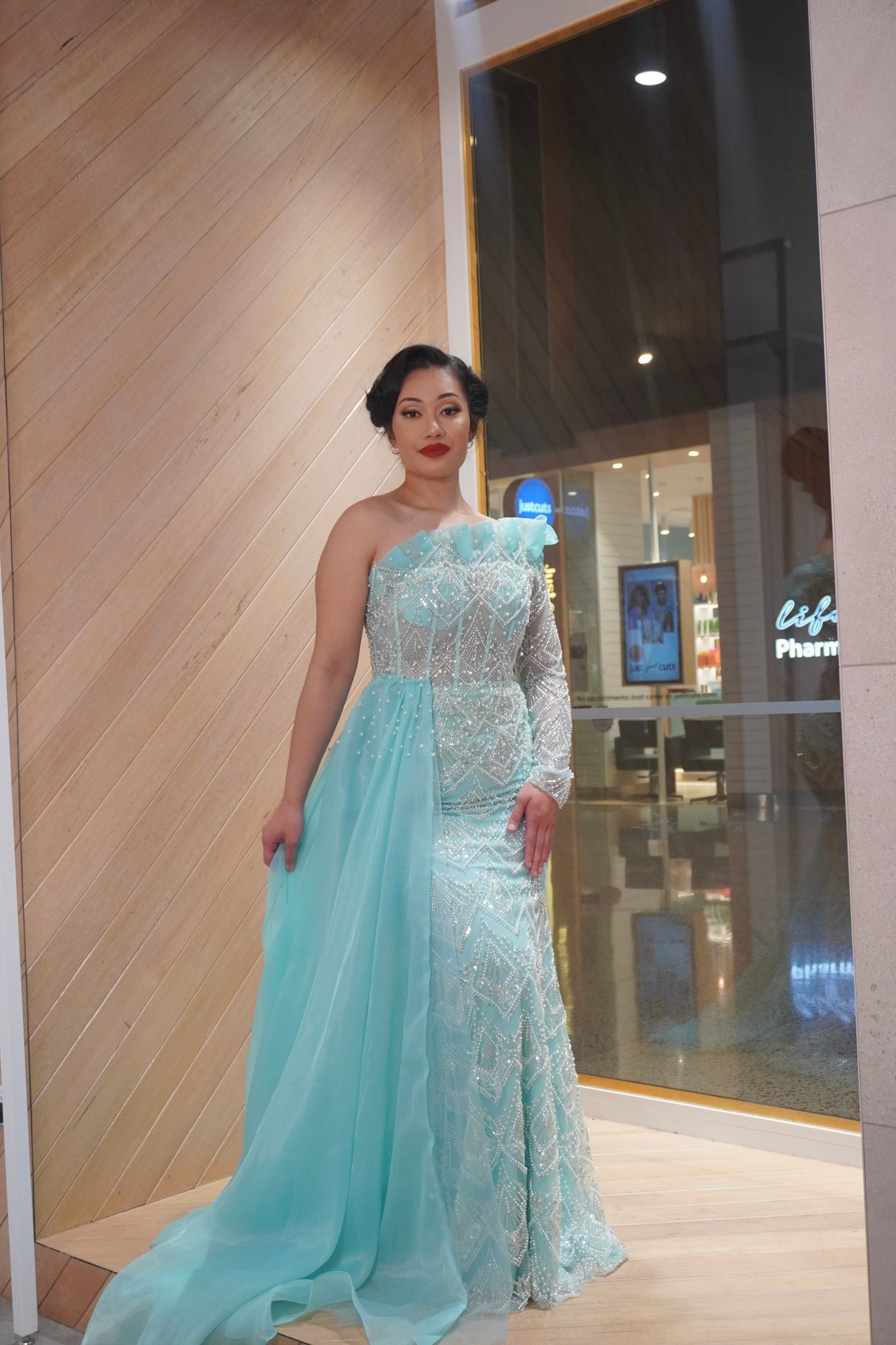 This Serenity dress is a aquamarine gown with long sleeves and intricate beading throughout, creating a beautiful and sophisticated pattern. The gown features a unique ruffled neckline that adds an element of drama and elegance. The fitted silhouette highlights the wearer's figure, while a draped sash adds a touch of softness and fluidity to the overall look. The gown extends into a modest train, making it a perfect choice for formal events where grace and sophistication are key.