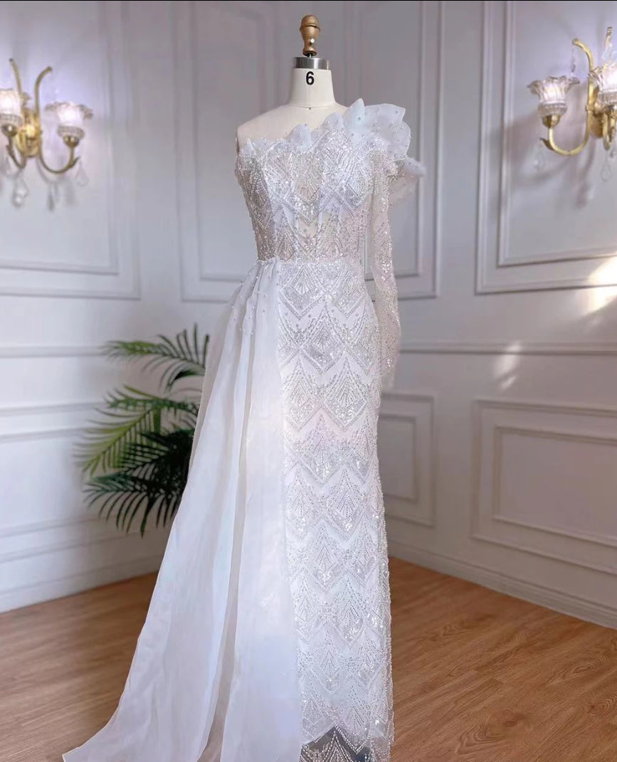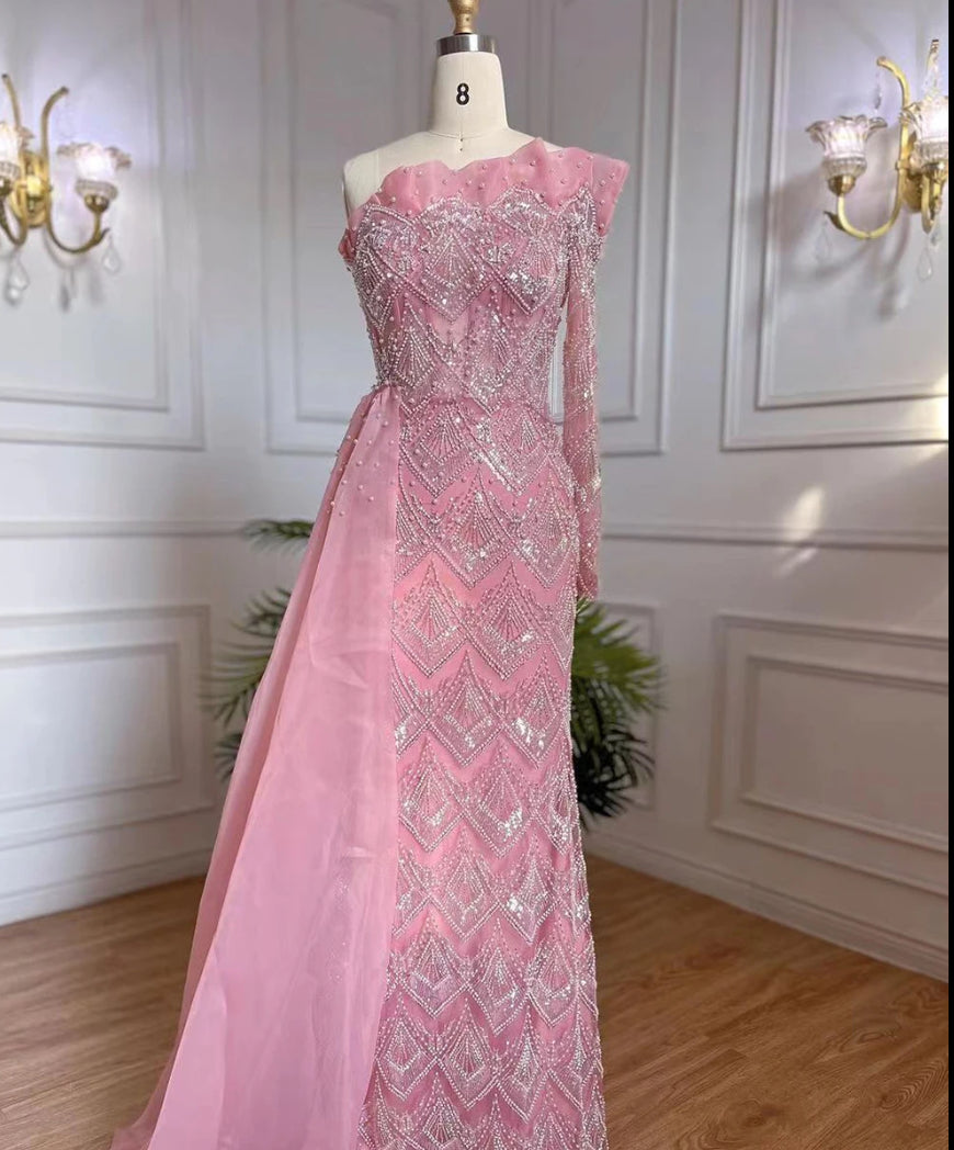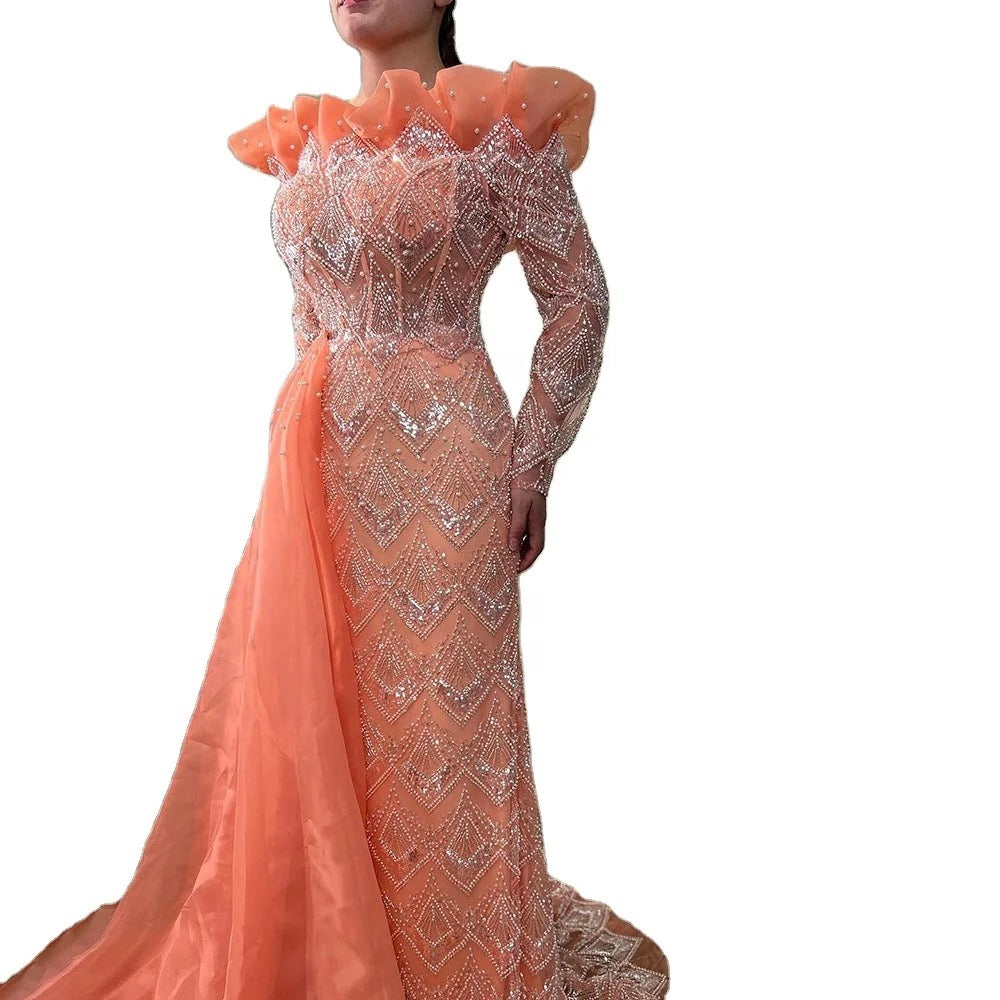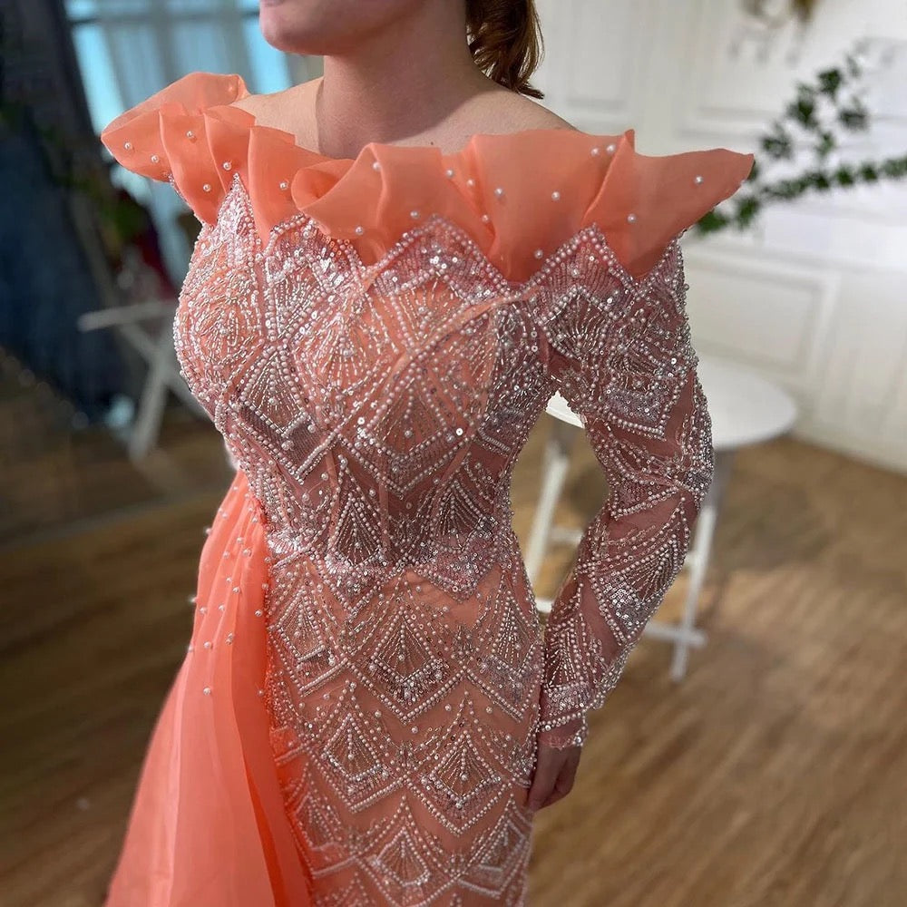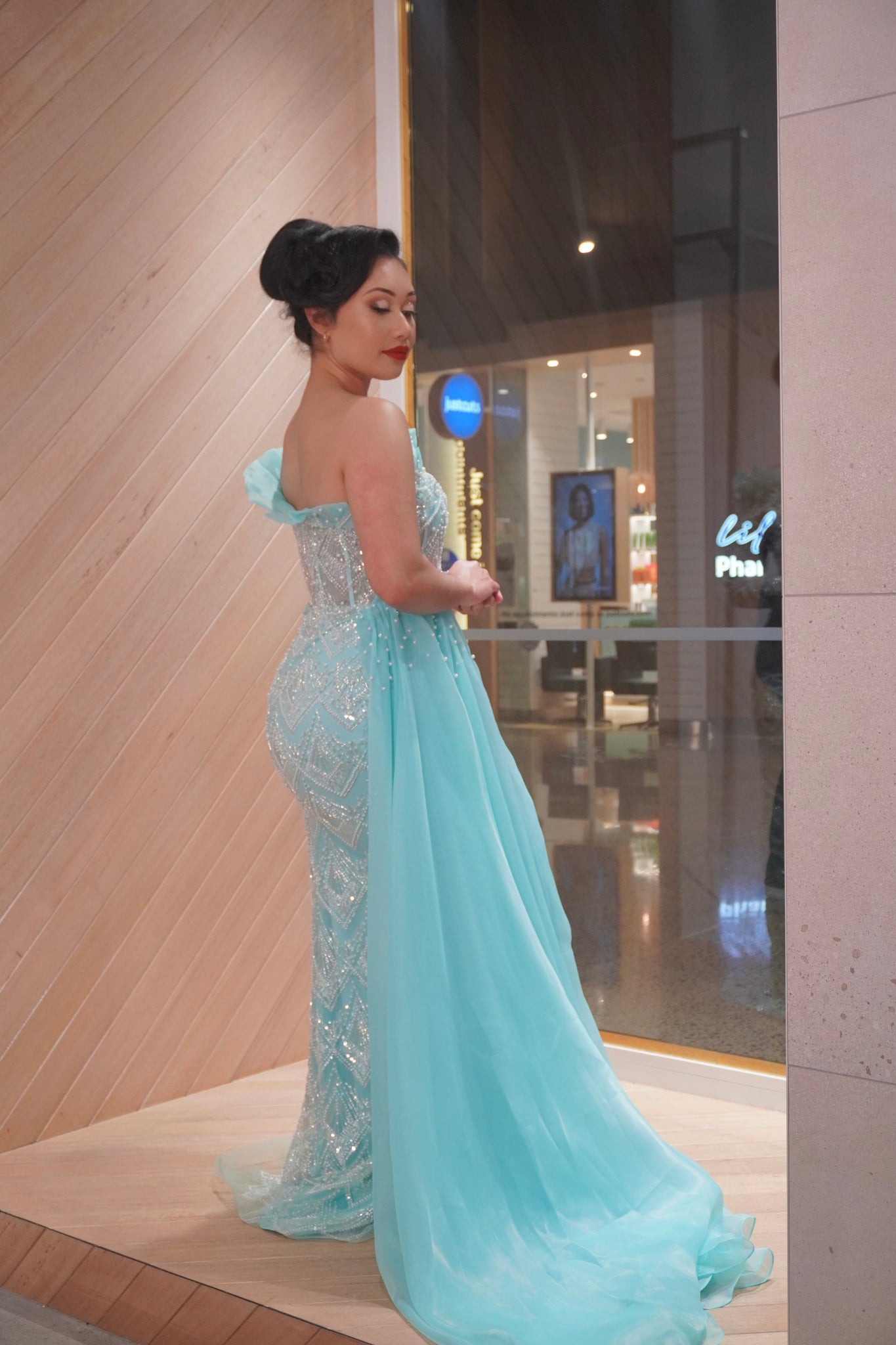 This Serenity dress is a aquamarine gown with long sleeves and intricate beading throughout, creating a beautiful and sophisticated pattern. The gown features a unique ruffled neckline that adds an element of drama and elegance. The fitted silhouette highlights the wearer's figure, while a draped sash adds a touch of softness and fluidity to the overall look. The gown extends into a modest train, making it a perfect choice for formal events where grace and sophistication are key.
