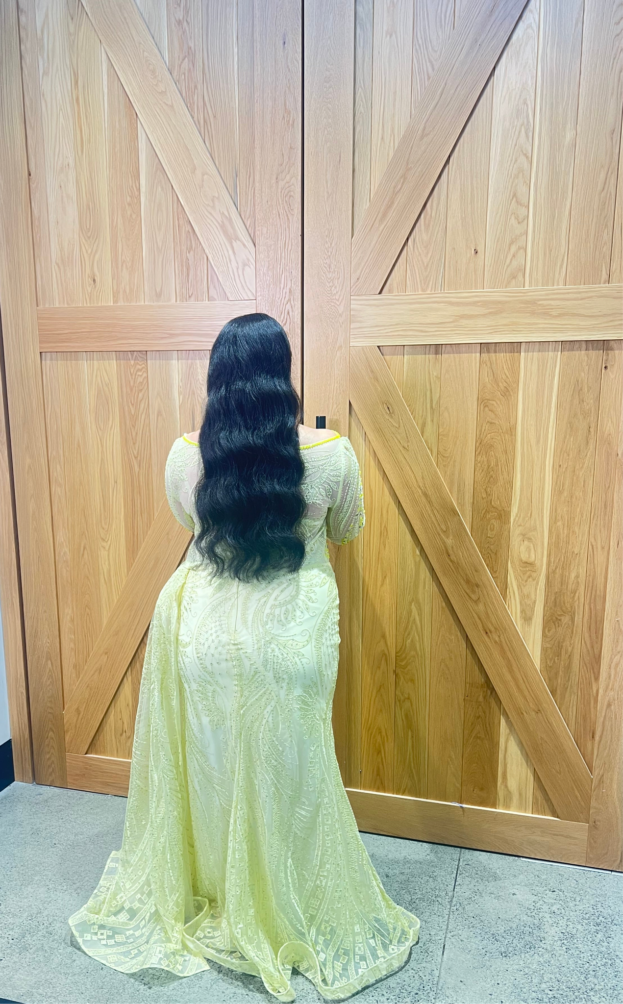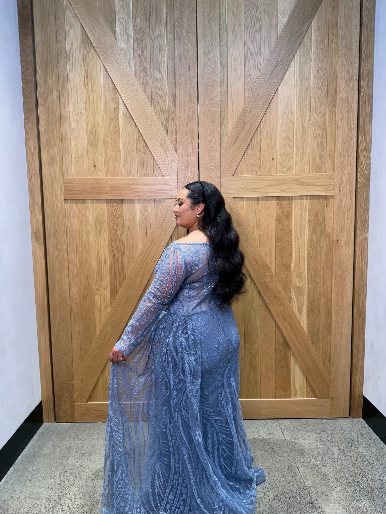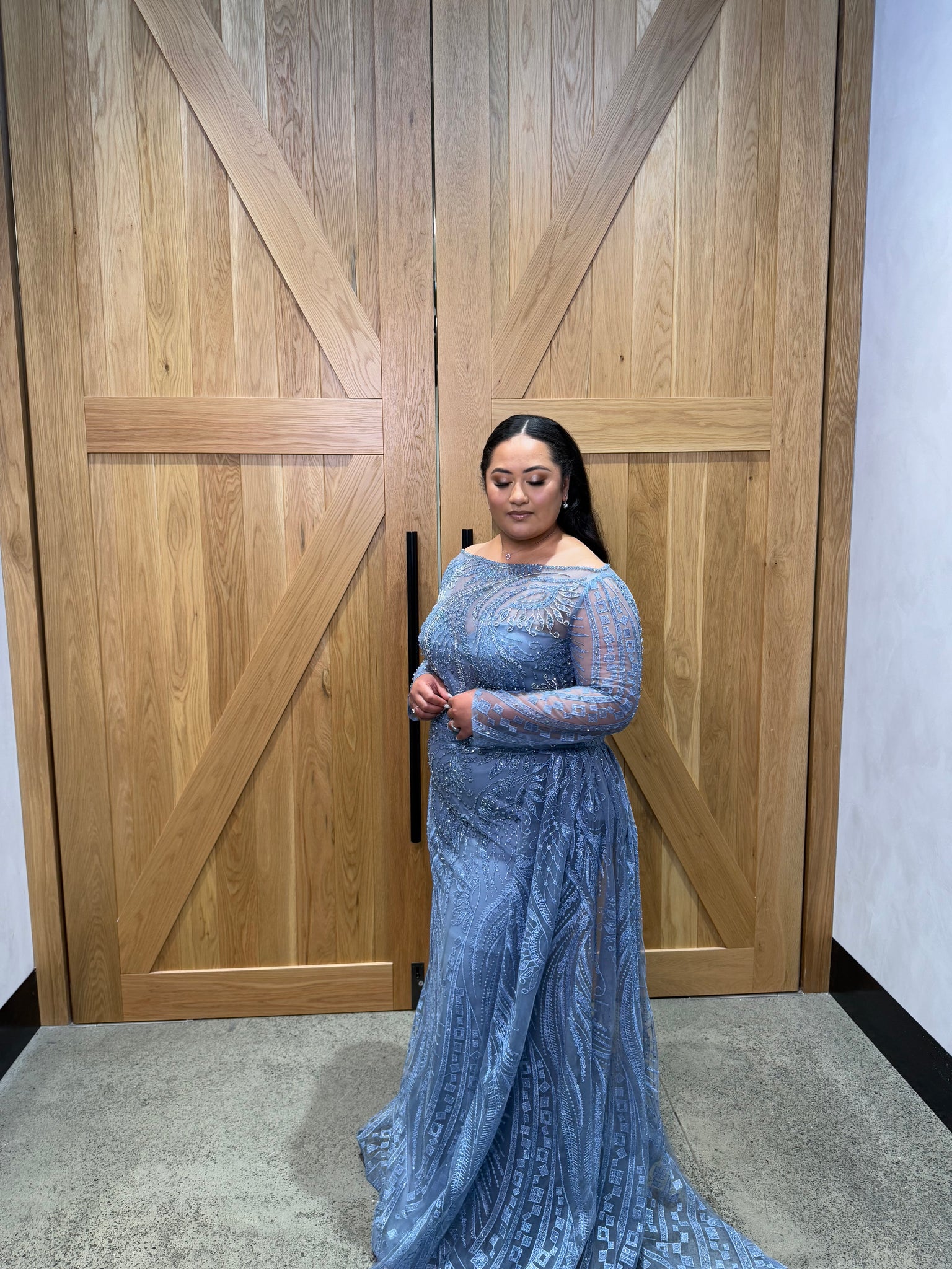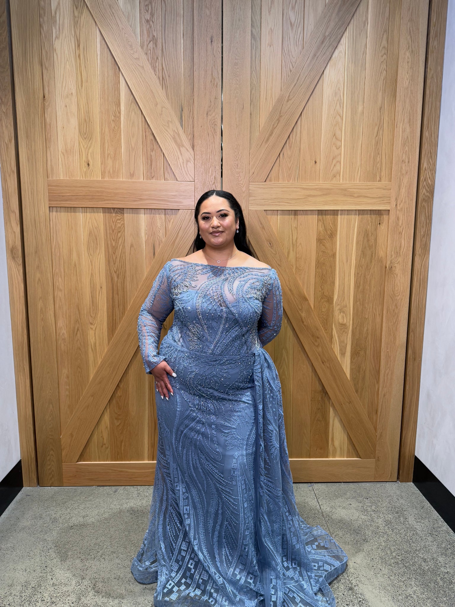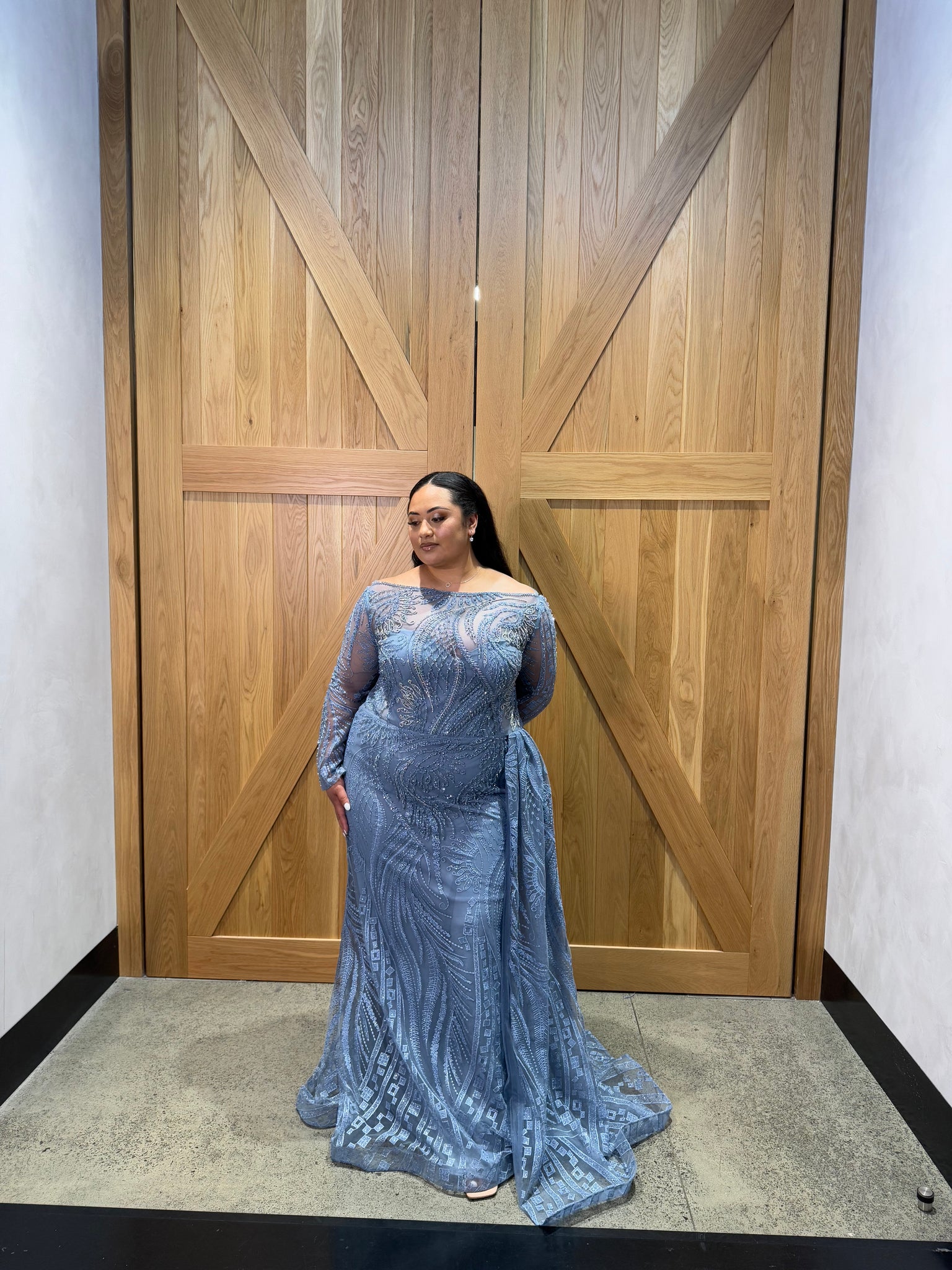 Elegance in every stitch — this steel blue long-sleeve gown features intricate sequin detailing and a flattering draped waist sash. Perfect for formal events or red-carpet moments.